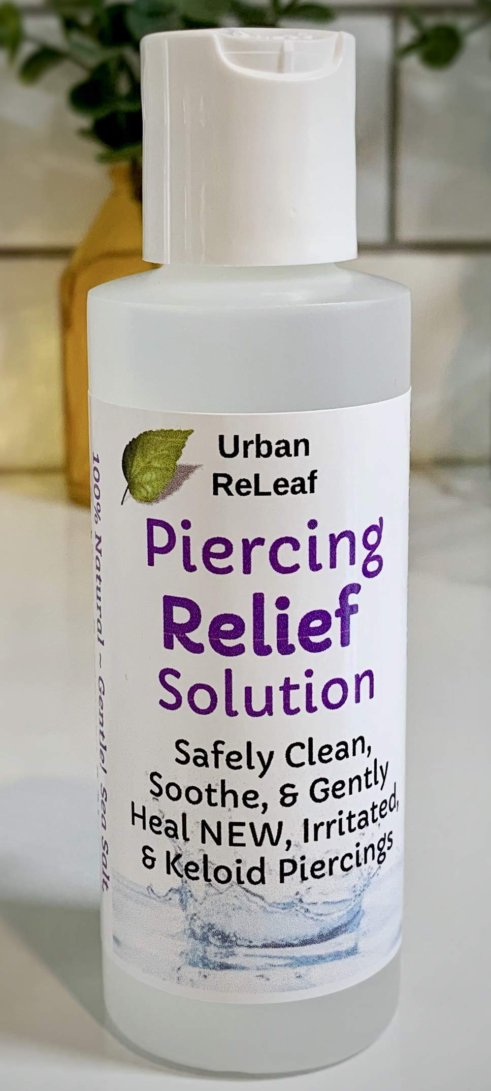 - PIERCING RELIEF Solution - the natural solution to AFTERCARE! Ready to use, 4 oz. Medicated Sea Salt soaks are the best thing you can do for a new, irritated or keloid piercing. PIERCING RELIEF Solution - the natural solution to AFTERCARE! Works fast to heal the 'red and angry' feeling in new piercings.