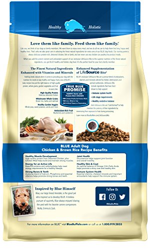 - A NATURAL DOG FOOD: BLUE dry dog food is made with the finest natural ingredients enhanced with vitamins and minerals. BLUE contains NO chicken (or poultry) by-product meals corn, wheat, soy, artificial flavors or preservatives.