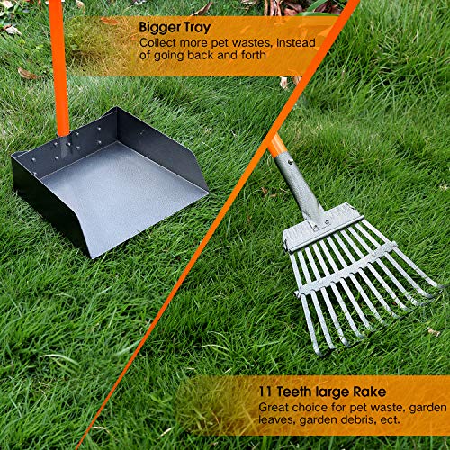 - Ideal Choice for Large Dogs: Our pooper scooper boasts a durable metal large tray (size:10.2“×9.2”, 50% bigger than other normal one), so you don't have to go back and forth to empty pan constantly any more. The metal rake comes with 11 teeth, which makes cleanup of your pet’s waste in the yard a breeze. The dog poop scooper is an ideal choice for owners of multiple large dogs.