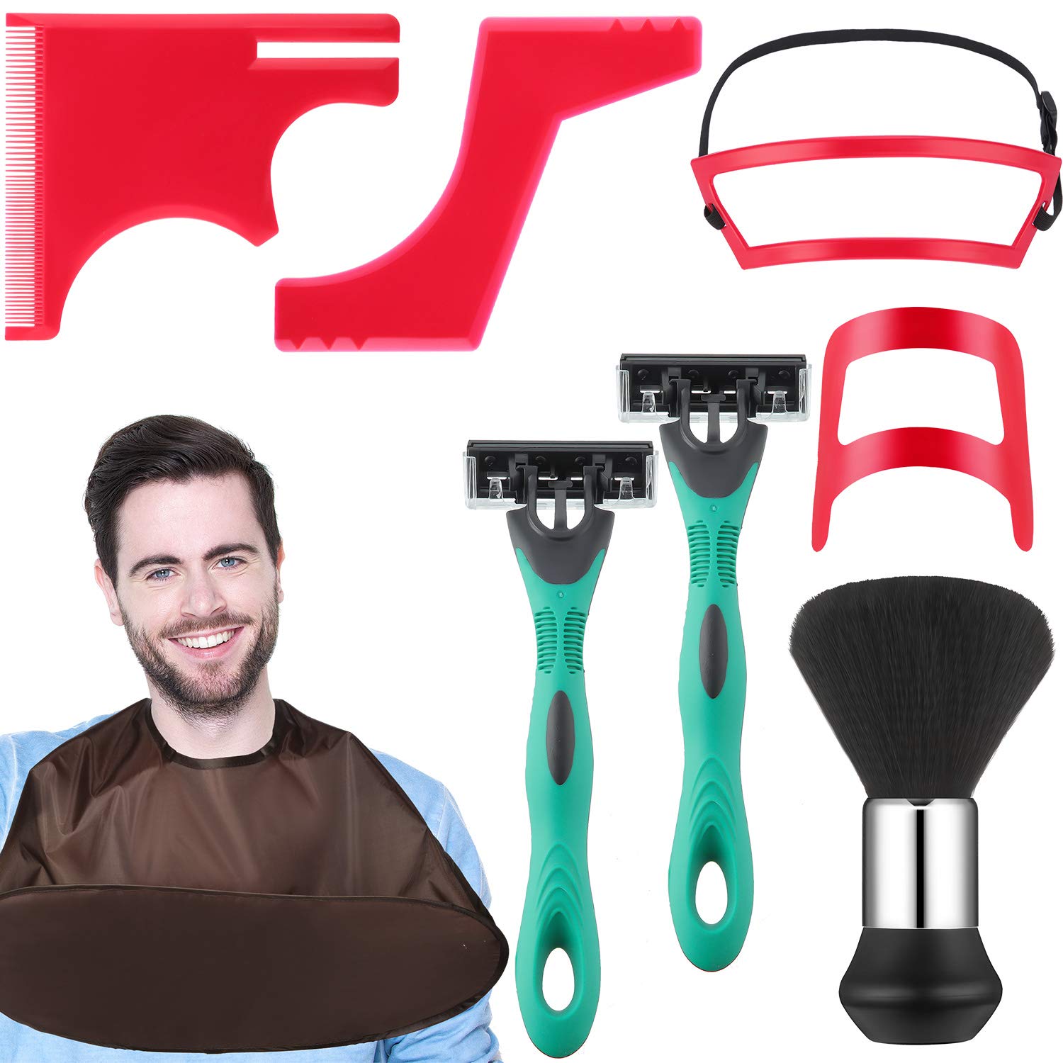 8 Piece Beard Shaping and Haircut Tool Kit, Includes Neckline Template Guide, Hairline Template Stencil with Beard Razors, Brush, Barber Cloak for Men Barber Supplies