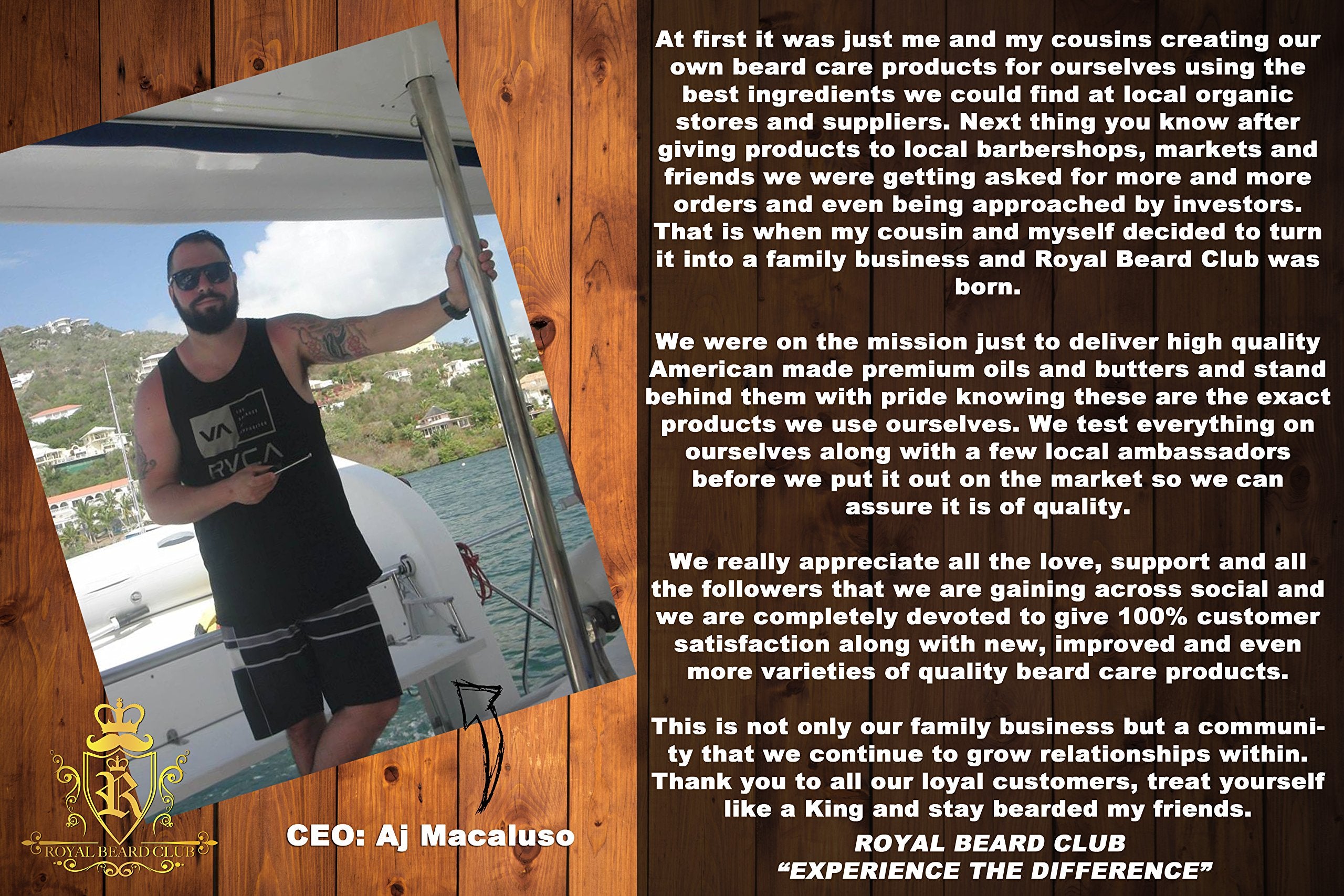 We tested all of our competitors beard care products and made ours better on purpose. Our beard balm, beard oils and grooming products are all made by us for us in the USA with premium organic and natural ingredients without cheaping out on what really gives you the best benefits, Royal Beard Club is set out to make not only the best beard care products on the market but to grow a real community. We are a local family business in eastern Long Island, New York and we started making quality beard care products for ourselves because many competitors were using cheap, cheap ingredients and I can say without question that ours is superior compared to everyone that we have tested.