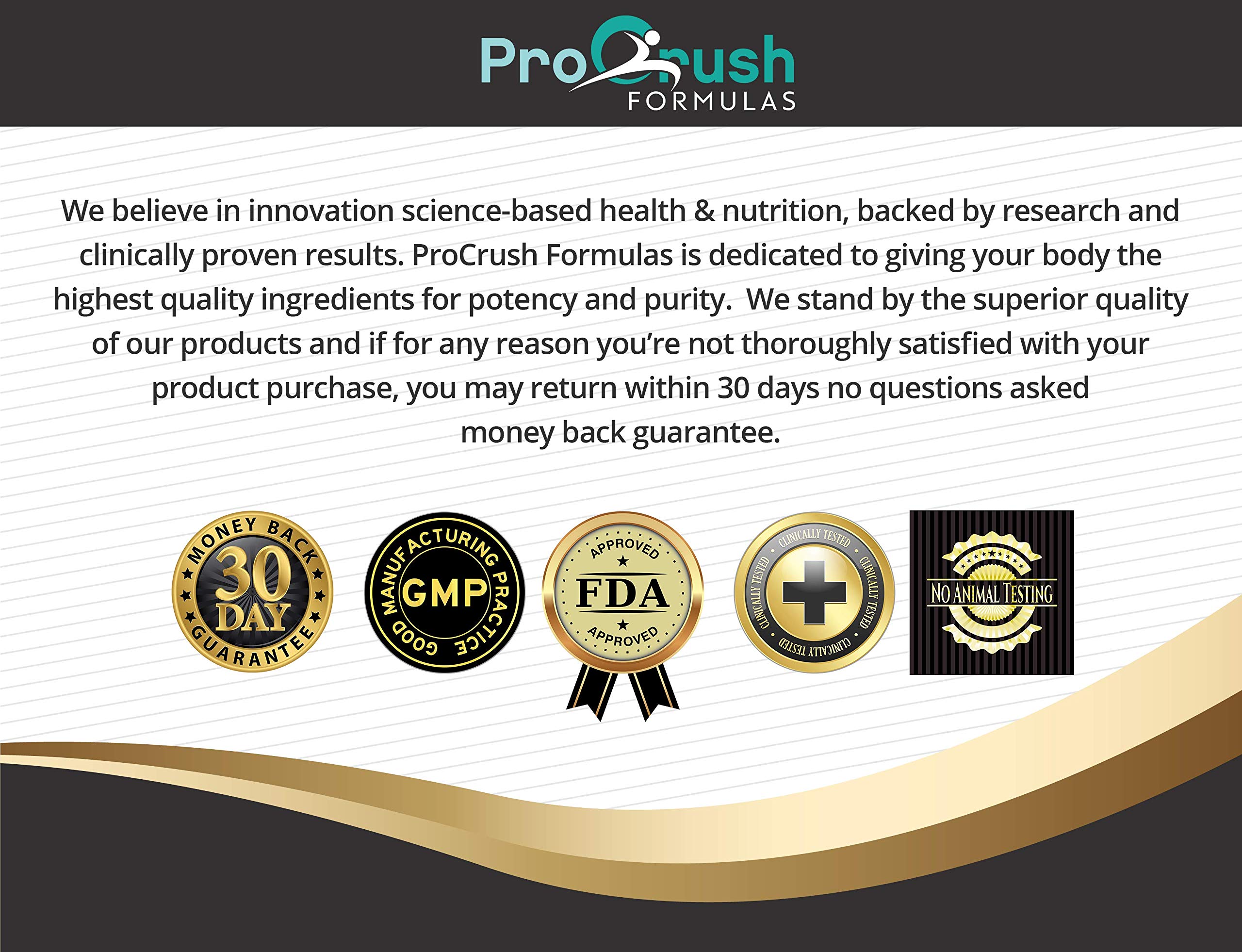 • We believe in innovation science-based health & nutrition, backed by research and clinically proven results. ProCrush Formulas is dedicated to giving your body the highest quality ingredients for potency and purity. We stand by the superior quality of our products and if for any reason you’re not thoroughly satisfied with your product purchase, you may return within 30 days no questions asked money back guarantee. Manufactured in the USA in a registered FDA facility.