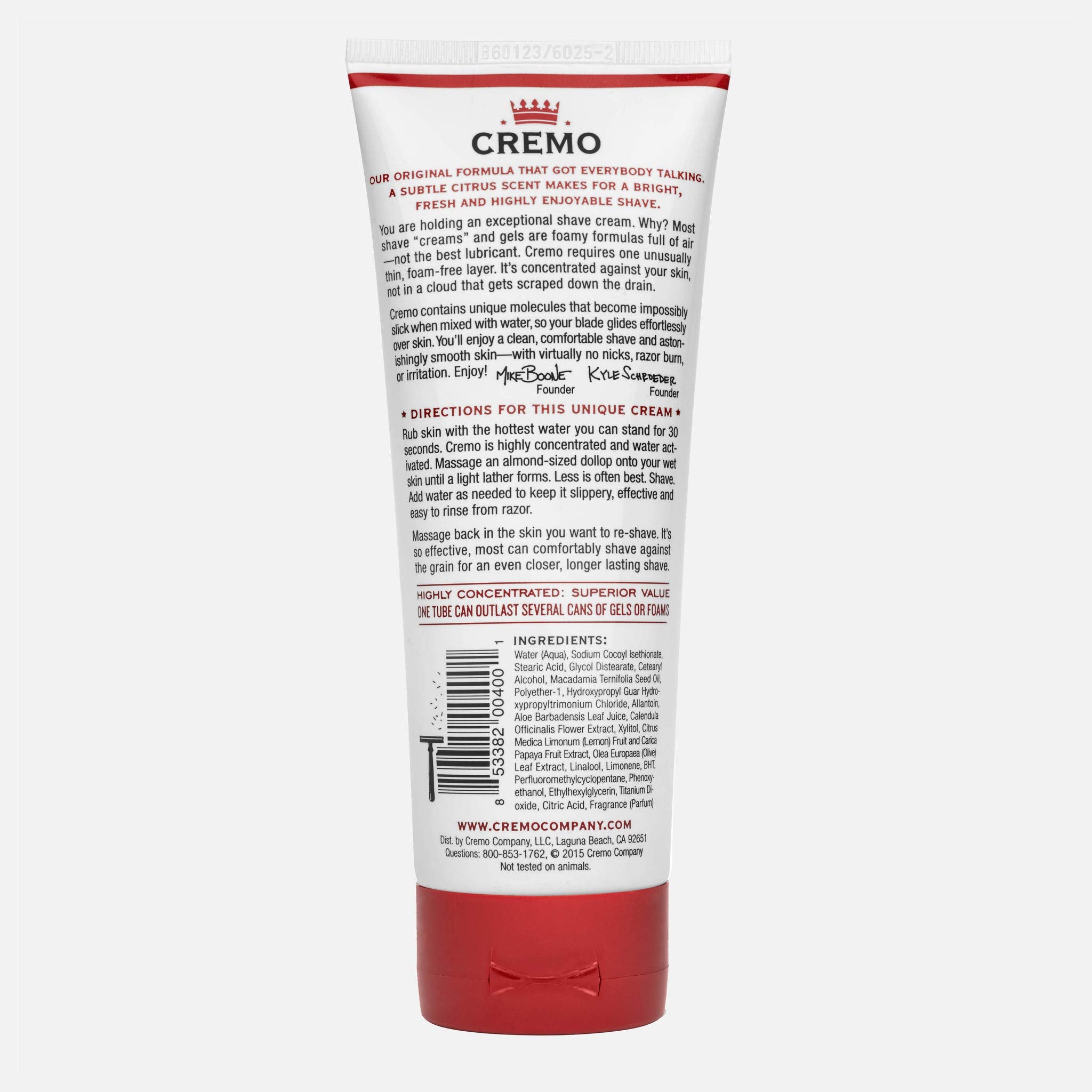 **Directions For A Dream Shave:** Rub your skin with the hottest water you can stand for 30 seconds (in the shower works best or use a hot towel). Leave your skin wet, as Cremo Cream is water-activated. Lightly coat your skin with an "almond-sized" squeeze of cream. Less is often best! Add a few drops of water to make and keep it slippery, the shave. If the razor clogs, use more water or less Cremo Cream.