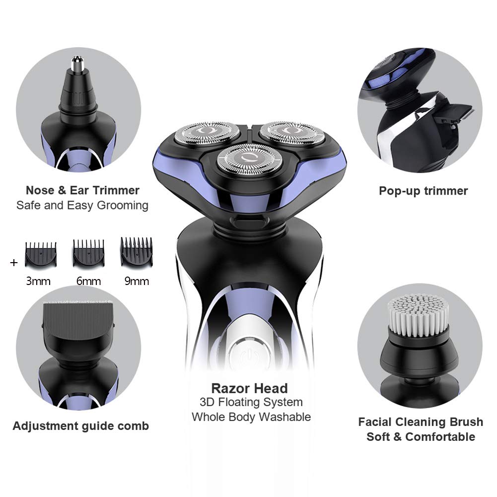 - 5 IN 1 MEN’S ELECTRIC RAZOR: This electric razor for men contains Beard Trimmer Head, Sideburns Trimmer Head, Nose Trimmer Head, facial brush and Hair Trimming Guards (3mm, 6mm, 9mm). With these different heads, you can design beard shapes, moustache and any facial hairstyle easily.