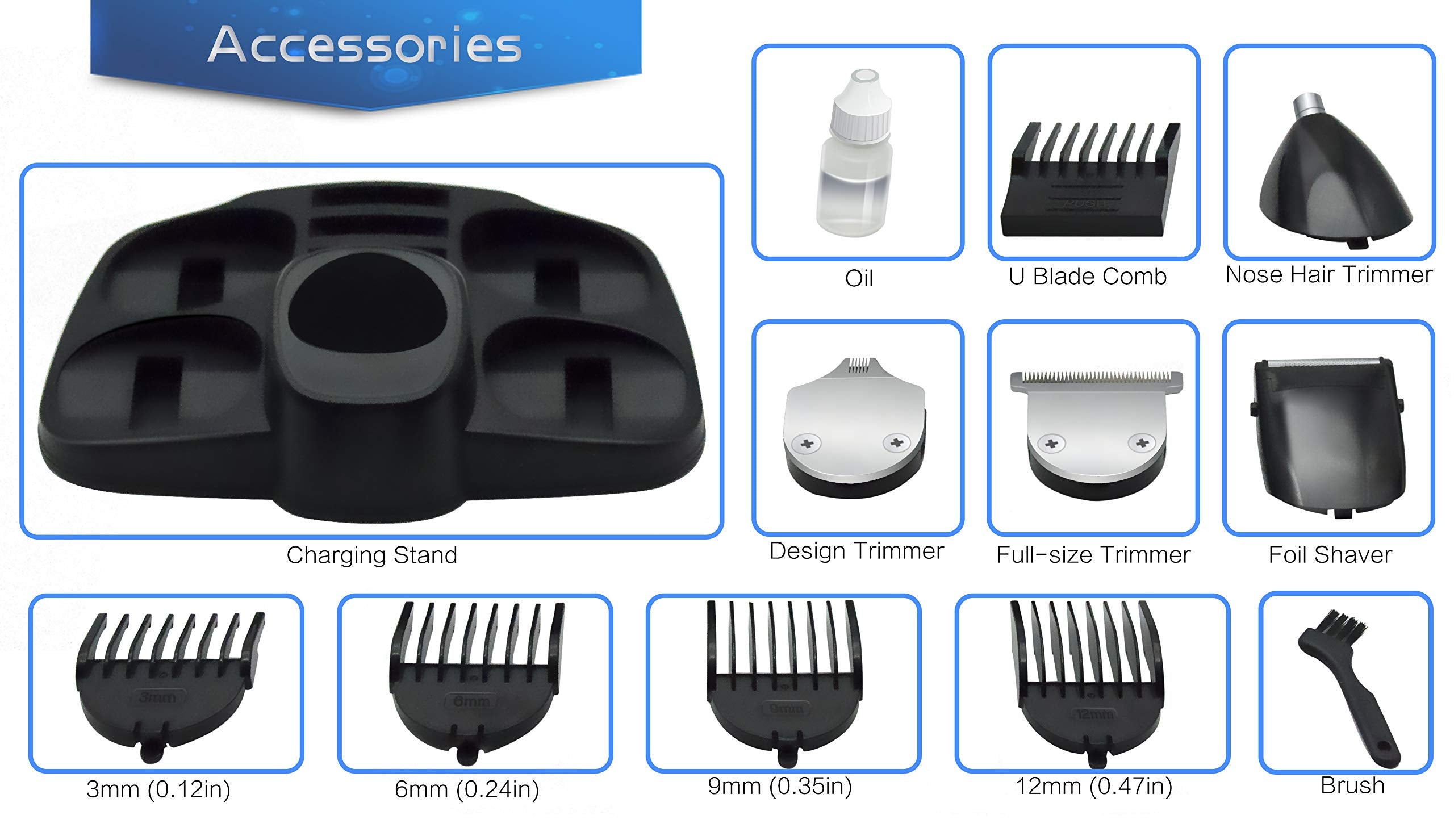 - ✅ ACCESSORIES PACKED -Come with 5 haircut combs(U/3/6/9/12mm) and a long hair comb positioning combs-Trim your hair to exactly the length you want, by locking in the setting that suits your desired look,you can easily trim hair perfectly