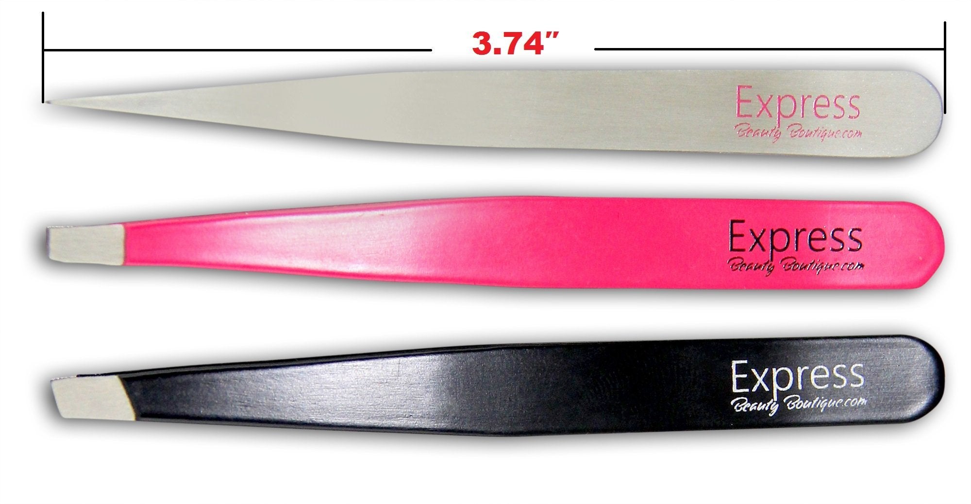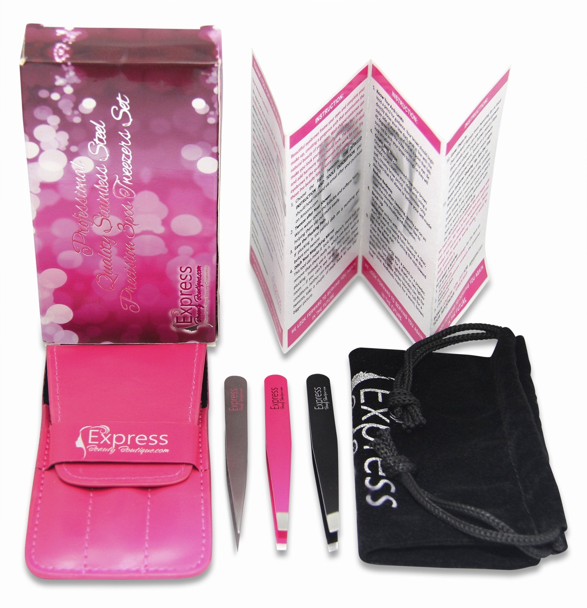 Express Beauty Boutique Tweezers 3pcs Set Pink Case Professional Quality Stainless Steel Precision Eyebrow Tweezer for Ingrown Hair Shaping Eyebrows.