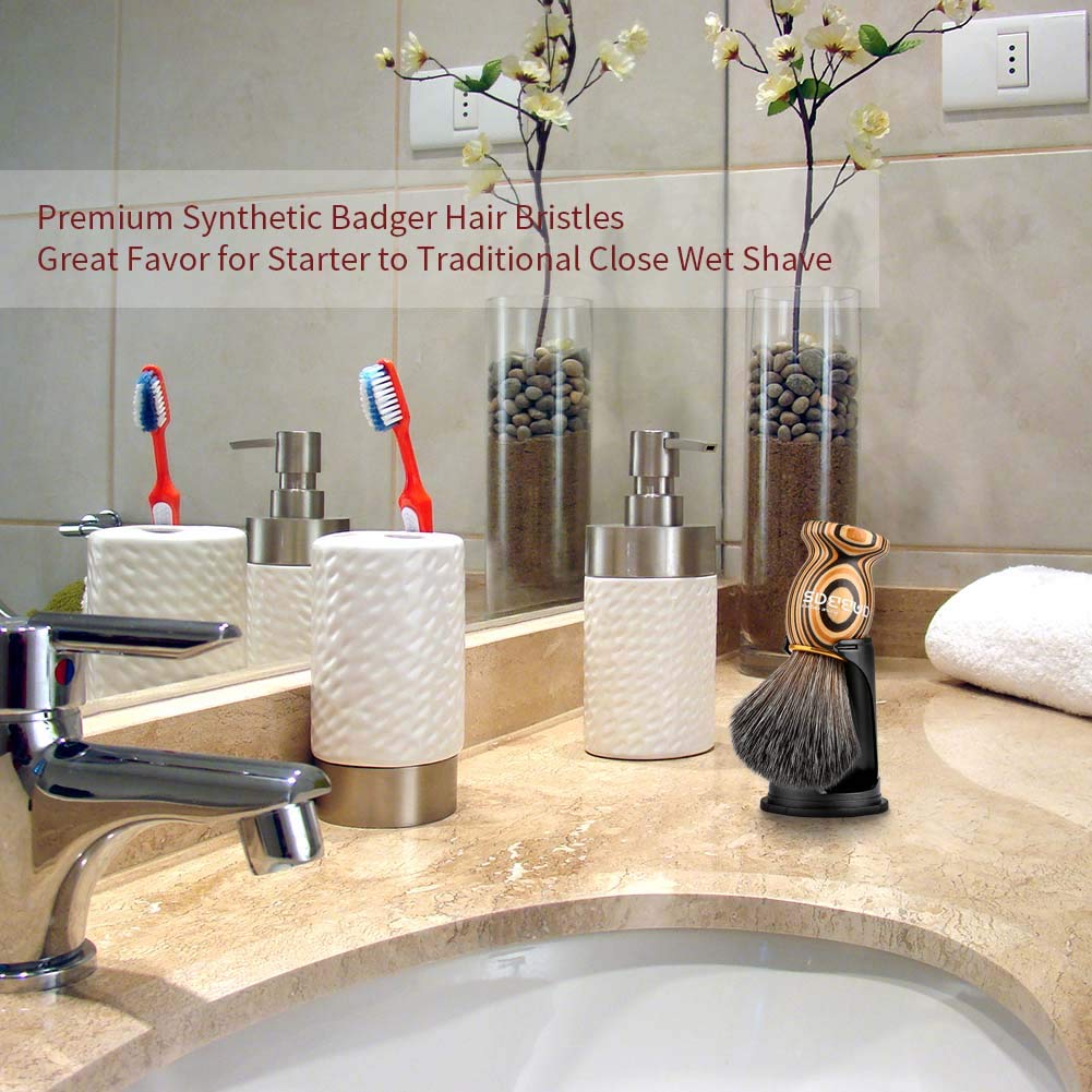 - ACCESSORY: Package with a contracted design plactic brush stand; Recommend thoroughly clean the shaving brush after each use and hang it to dry for brush long service lifetime.