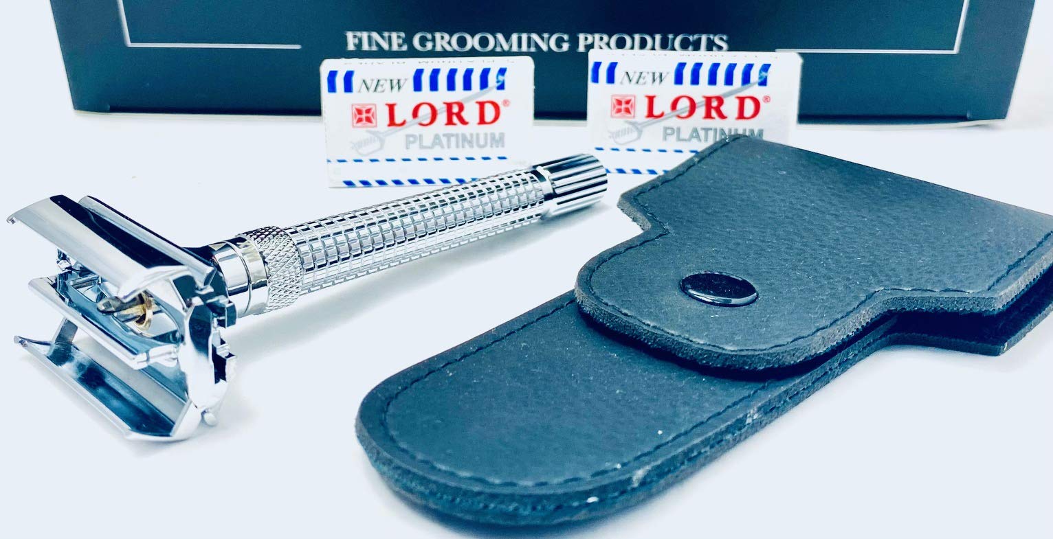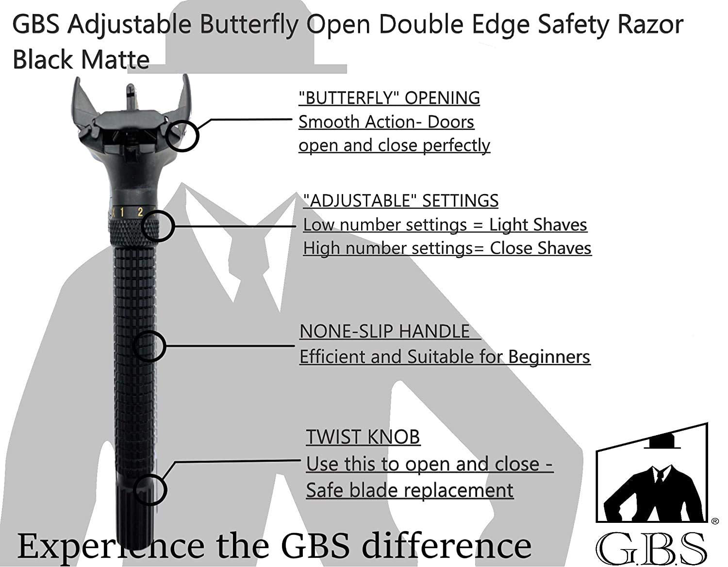 GBS Adjustable DE Butterfly Razor Stainless Steel Knurled Handle - Great for Beginners & Experience Shaver Who Want a More Aggressive Shave