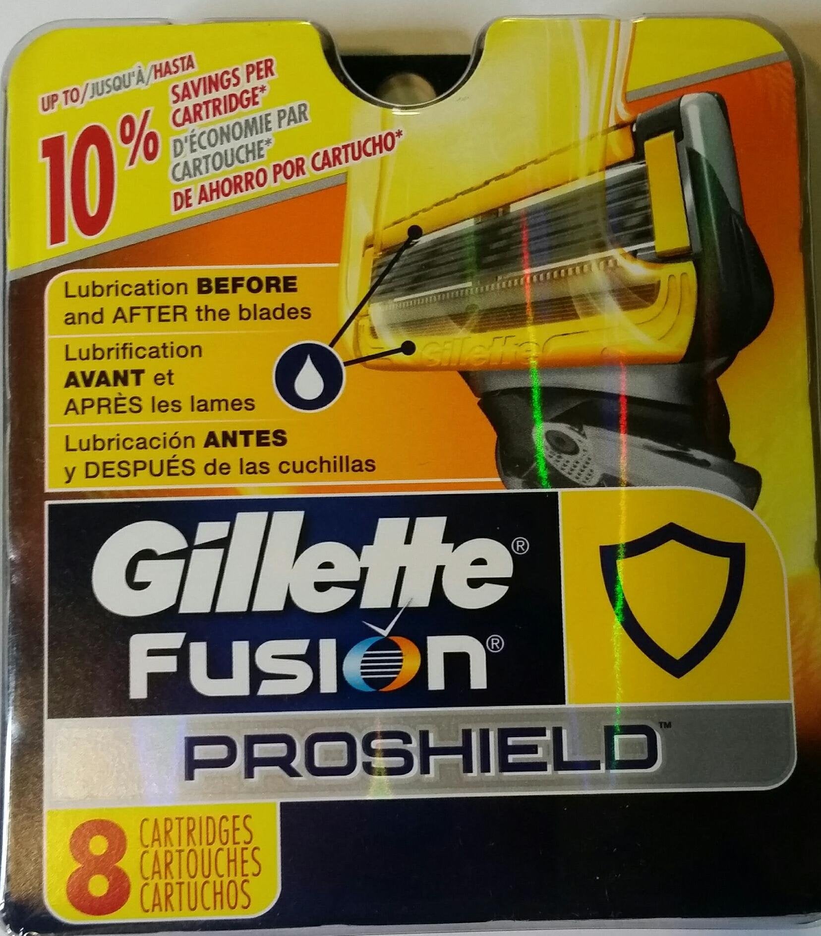 Gillette : The Best a man can get. ProShield: Lubrication before and after the blades The Package contains: Razor Refill Cartridges 8 Count Fits all Fusion Handles Made in USA Brand: Visit the Gillette Store Gillette Proshield Refill Cartridges 8 Count -Made in USA by Gillette Store