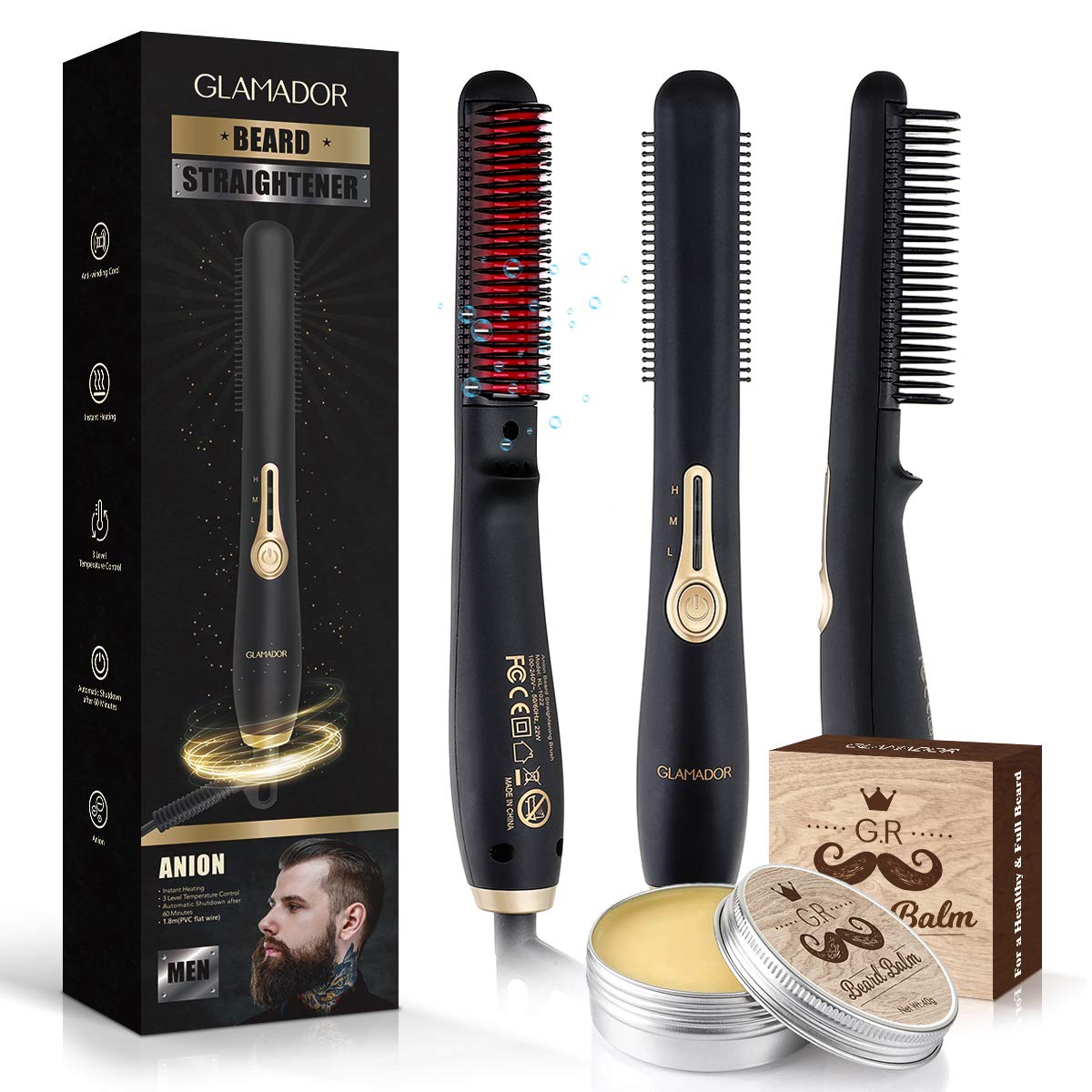 GLAMADOR Beard Straightener Comb for Men, Portable Anti-Scald Hair Straightening Brush, Instant Heating Ionic Beard Comb with Beard Balm- 3 Level Adjustable Temperatures, Gifts for Him by GLAMADOR Store