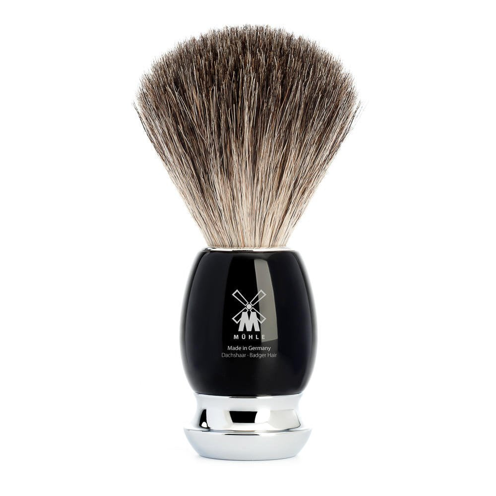 The Material - High-grade resin.. High-grade resin is a high-quality synthetic material, the surface of which is processed and refined separately. The material is ideal for exclusive accessories and writing implements because it facilitates a broad spectrum of modern and classical designs in many attractive colours... To begin with, the aesthetic basic shapes for brush and razor handles are turned out of solid rods. Then each individual work piece is polished in several passes to give the surface its special gleam. This processing method lends the models a pleasant feel and secures their beauty for many years to come... Without chrome the world would forfeit a lot of its lustre. In the finish used for our wet shaving accessories it demonstrates its best qualities: The material is corrosion-resistant, very long-lasting and has a luxurious, alluring lustre. When contrasted with this, the colours and shapes of other premium materials are shown to their very best advantage... The Brushhead - Pure badger.. Pure badger is the basic quality among the natural hair types. The material is recognizable by its relatively dark colouring. The individual hairs are somewhat thicker, but still soft and much more flexible than bristles... This quality is highly recommended for those wishing to take a badger hair brush that provides a slightly stronger massage effect. We manufacture this product mechanically according to the same high standards which we apply to all MUHLE products..