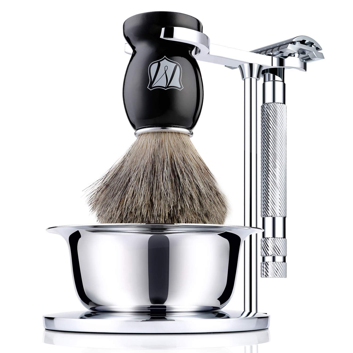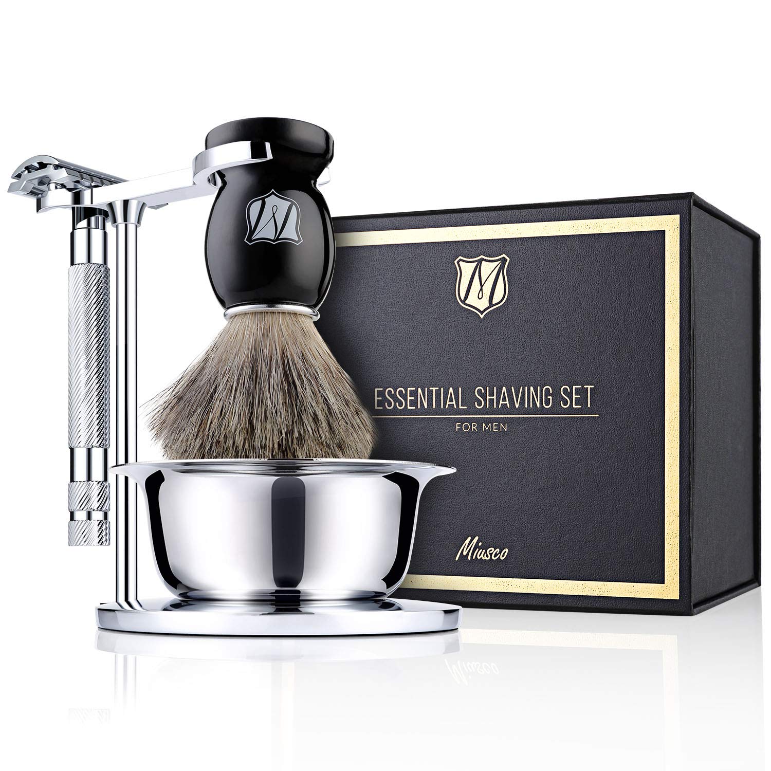 Miusco Men's Wet Shaving Kit, 4 Piece, Badger Hair Shaving Brush, Hand Polished Stainless Steel Shaving Stand, Shaving Bowl & Safety Razor