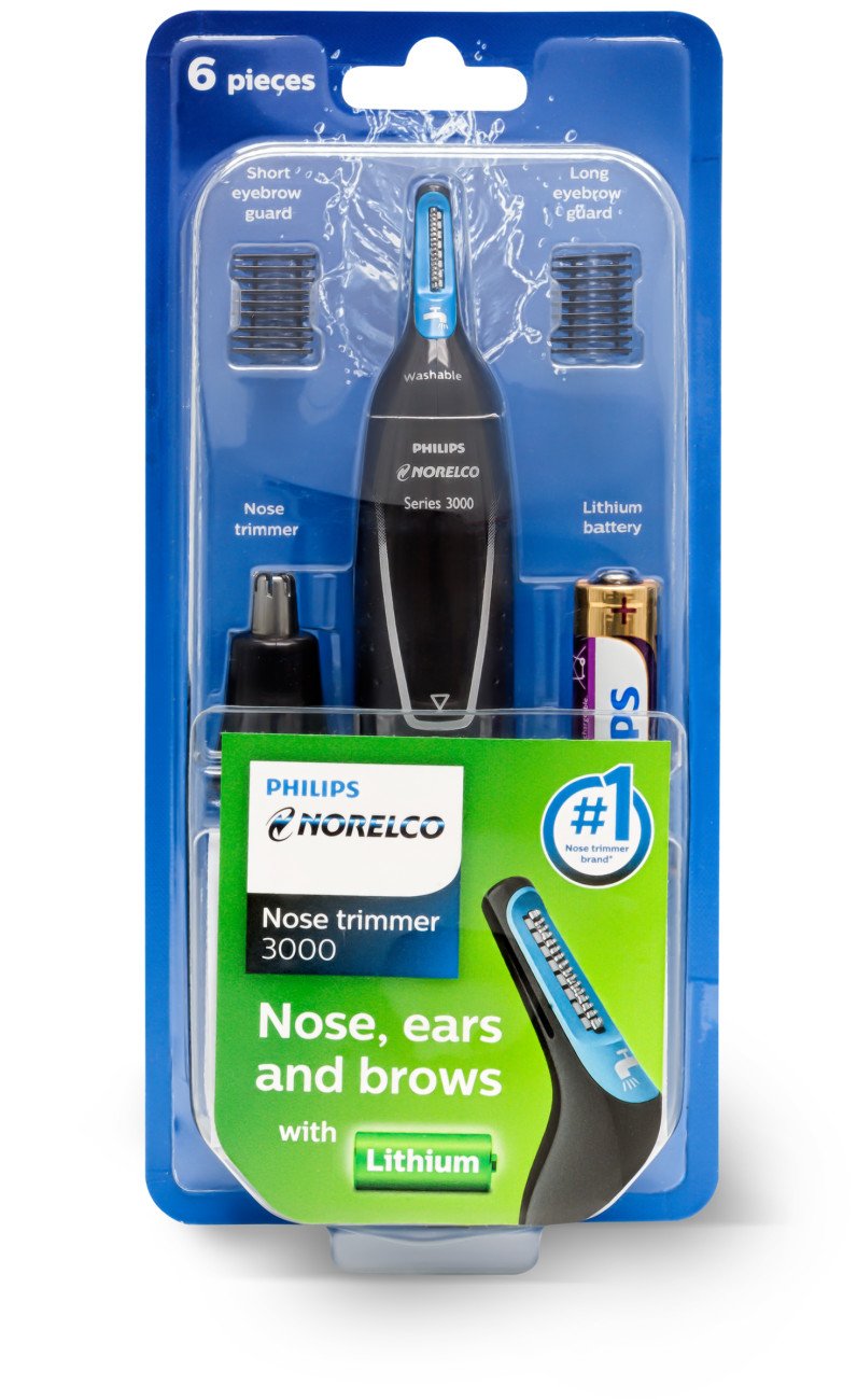 Philips Norelco Nose trimmer 3000, NT3000/49, with 6 pieces for nose, ears and eyebrows. Troubleshooting : In case of the appliance not perfoming well, it may be due hairs stuck in the cutting element or guards. If there are issues with the speed or rpm of the product, try checking the status of the disposable battery or insert a new battery.