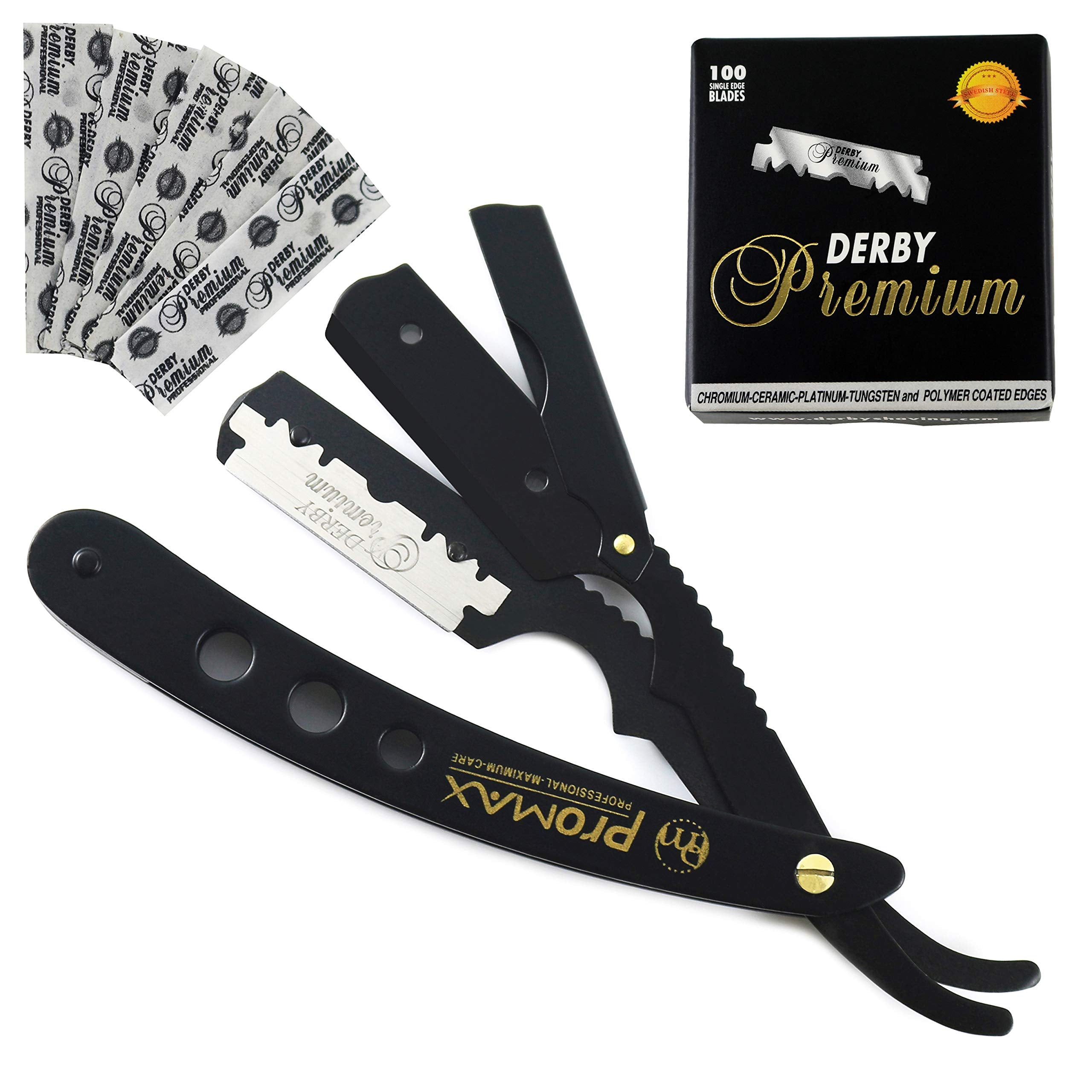 - STYLISH YET ERGONOMIC DESIGN:- Set in matte black and shine gold accents, our cutthroat razor gives that feel of classy construction and masculine design; double-coated to prevent chipping and add make this barber blade razor sturdier