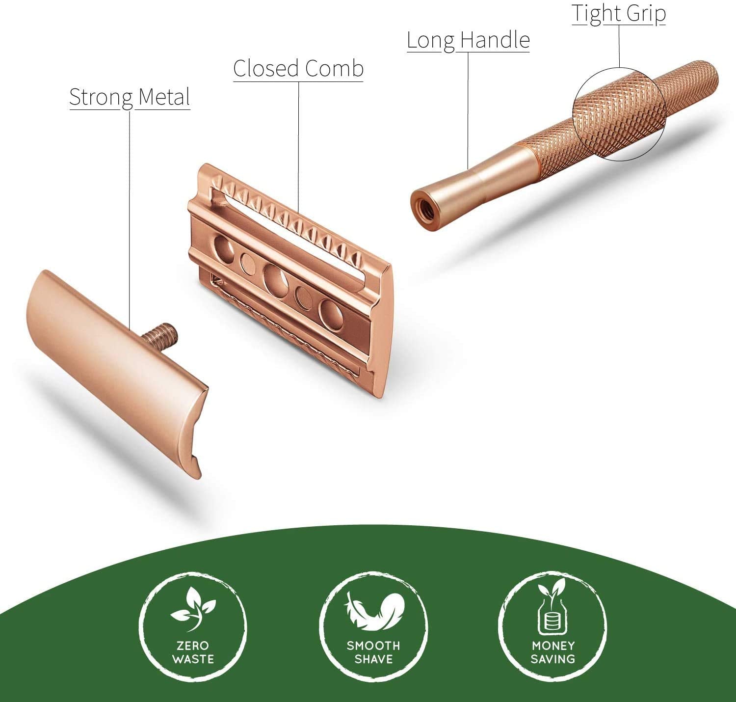 • USER MANUAL: The rose gold safety razor includes an in-depth digital shaving manual. The manual guides you on how to use the safety razor for legs and all other body parts. It also has tips on extending the life of blades and the reusable razor, responsible recycling, as well as 2 homemade recipes for shaving cream.