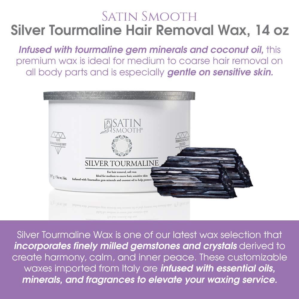 - INCORPORATES FINELY MILLED GEMSTONES AND CRYSTALS: Enhance your waxing treatments with timeless gemstones! Designed to provide a well-balanced and professional service. Satin Smooth Silver Tourmaline Depilatory Wax incorporates finely milled gemstones and crystal derived from the Chakra balancing assortment to promote harmony, calm, and inner peace. Offering highly enriched premium resinate, lightly scented with rose and gives superior wax application, hair removal, and skin response.