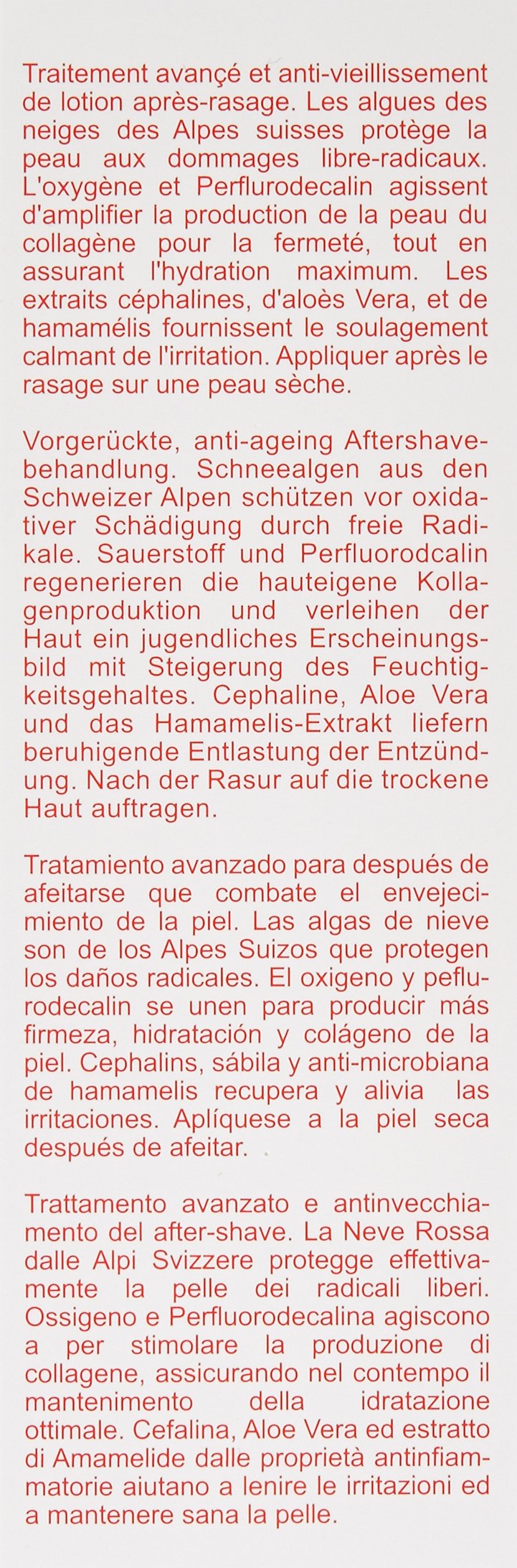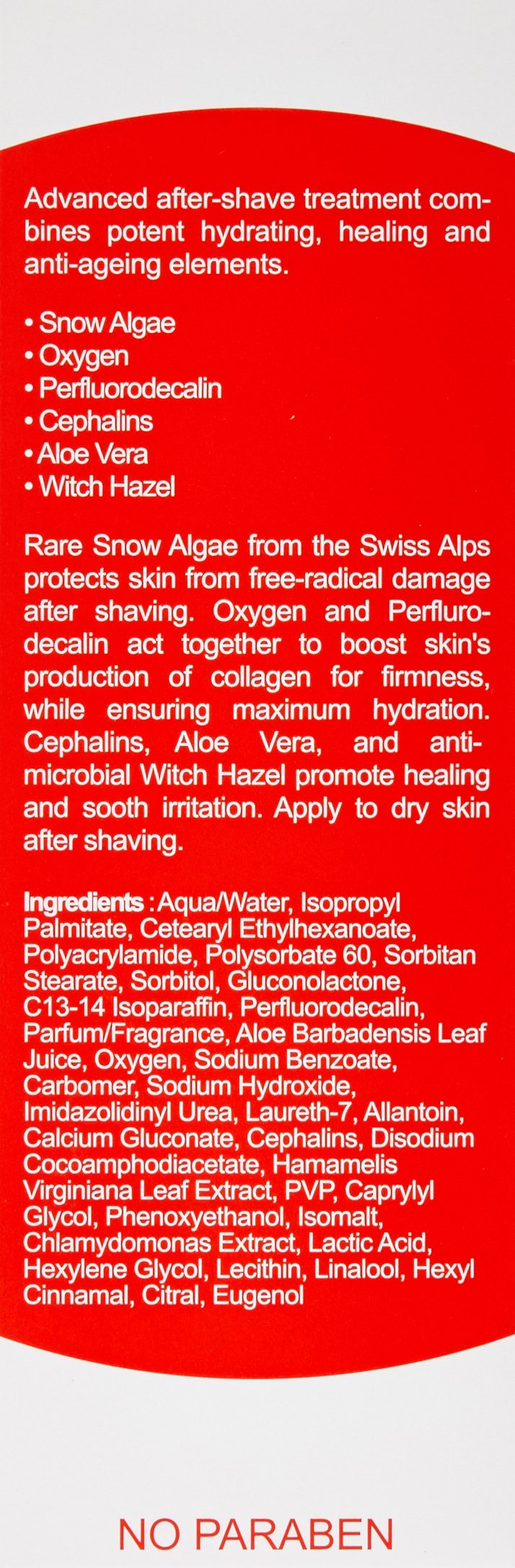 Rare Snow Algae from the Swiss Alps protects skin from free-radical damage after shaving. Pure oxygen boosts the skin's production of collagen for firmness, while ensuring maximum hydration. Cephalins, Aloe Vera and anti- microbial witch hazel promote healing and soothe irritation.