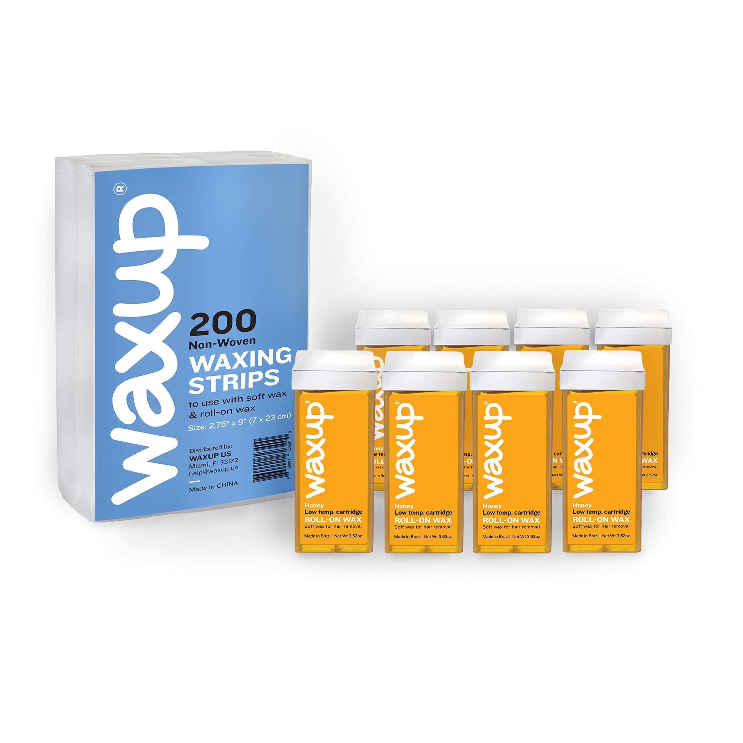 waxup Honey Roll On Wax 8 Pack and 200 Wax Strips, Pro Refill, Hot Hair Removal Wax Cartridge, Depilatory Wax Roller for Sensitive Skin, Home Self Waxing Body, Legs, Arms. Soft Wax Warmer not included by waxup Store