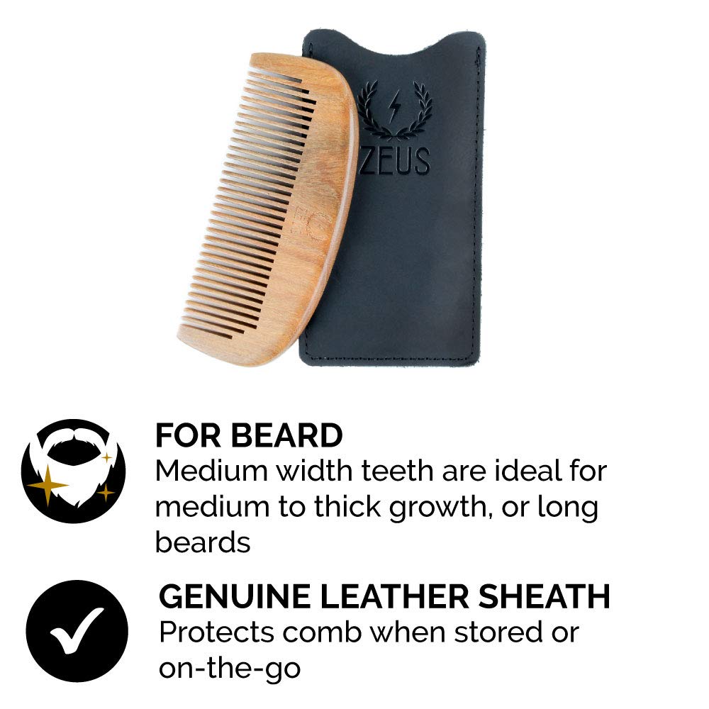 ZEUS Hand Polished Organic Sandalwood Comb Set with Leather Sheath for Mustache, Beard, and Hair - Best 3 Piece Set - Fine and Medium Teeth