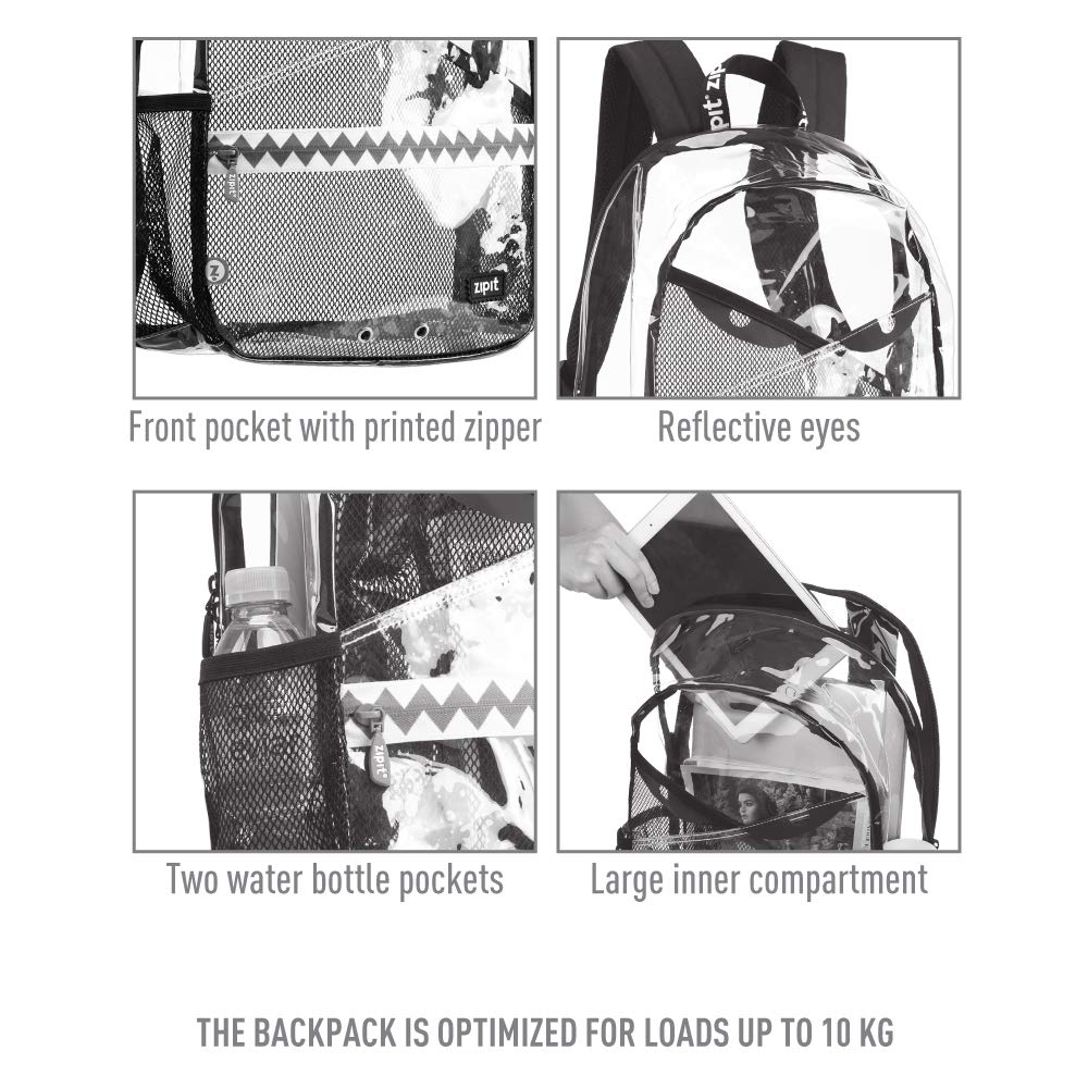 Look sharp and stay organized with our Clear Razor Backpack. Shifty reflective eyes and a printed zipper ‘mouth’ will give your child another reason to smile. With one roomy main compartment, 2 bottle pockets, 2 open pockets and one zippered outer pocket, there will always be an ideal spot for all your school-time essentials. This 12. 6” x 5. 5” x 16. 9” (32x14x42. 8CM) backpack is sized right and made to last using strong, lightweight transparent PVC material. Dirt and soil can be whisked away with a quick wash on gentle cycle. Looks, practicality and quality construction make a winning combination for storing: Laptop up to 14” Notebook, 3-ring binder Lunch, water bottle(s) etc. School/gym supplies Personal items, electronics and more Sleek, Multifunctional Design Warrior-inspired details combined with the transparent design give this hip student backpack a one-of-a-kind look. Great for everyday use or places/events that enforce a clear bag policy. The PVC material is lightweight, yet it has a flexible texture that makes it comfortable to carry on the back. About ZIPIT ZIPIT is proud to offer its clever product line in over 40 countries all around the world. Their creativity and design expertise are leading the way for innovation in storage. Purchase any of our products and join our mission to spread smiles and promote creativity and passion each and every day.