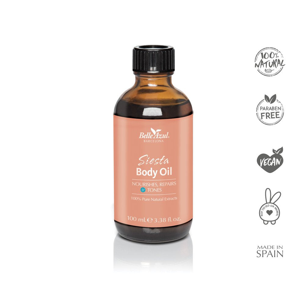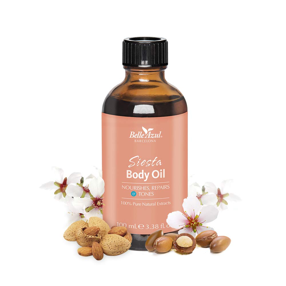 Belle Azul Siesta Body Oil - Firming, Toning & Moisturizing Bath, Body and Massage Oil for Dry Skin with Pure Argan Oil, Vitamin E, Sweet Almond Oil & Natural Essential Oils. 3.38 fl.oz.