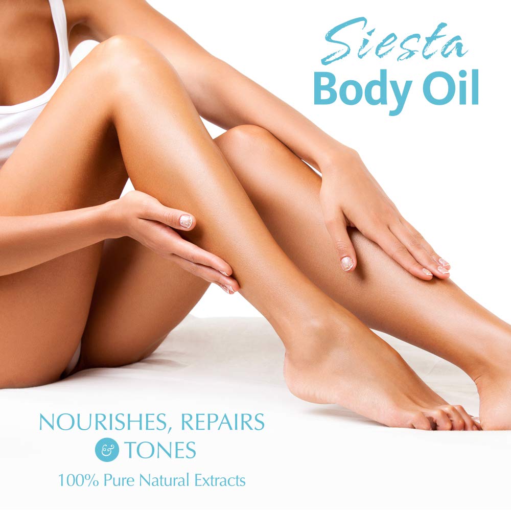 - VITAMIN E & FATTY ACIDS improve skin's texture and elasticity leaving it with a healthy radiant glow. Excellent hydrating body oil that you can use all over, leaving skin feeling supple and smooth to the touch! Add Siesta Oil to your bath for aromatherapy benefits to help unwind and release muscle tension.