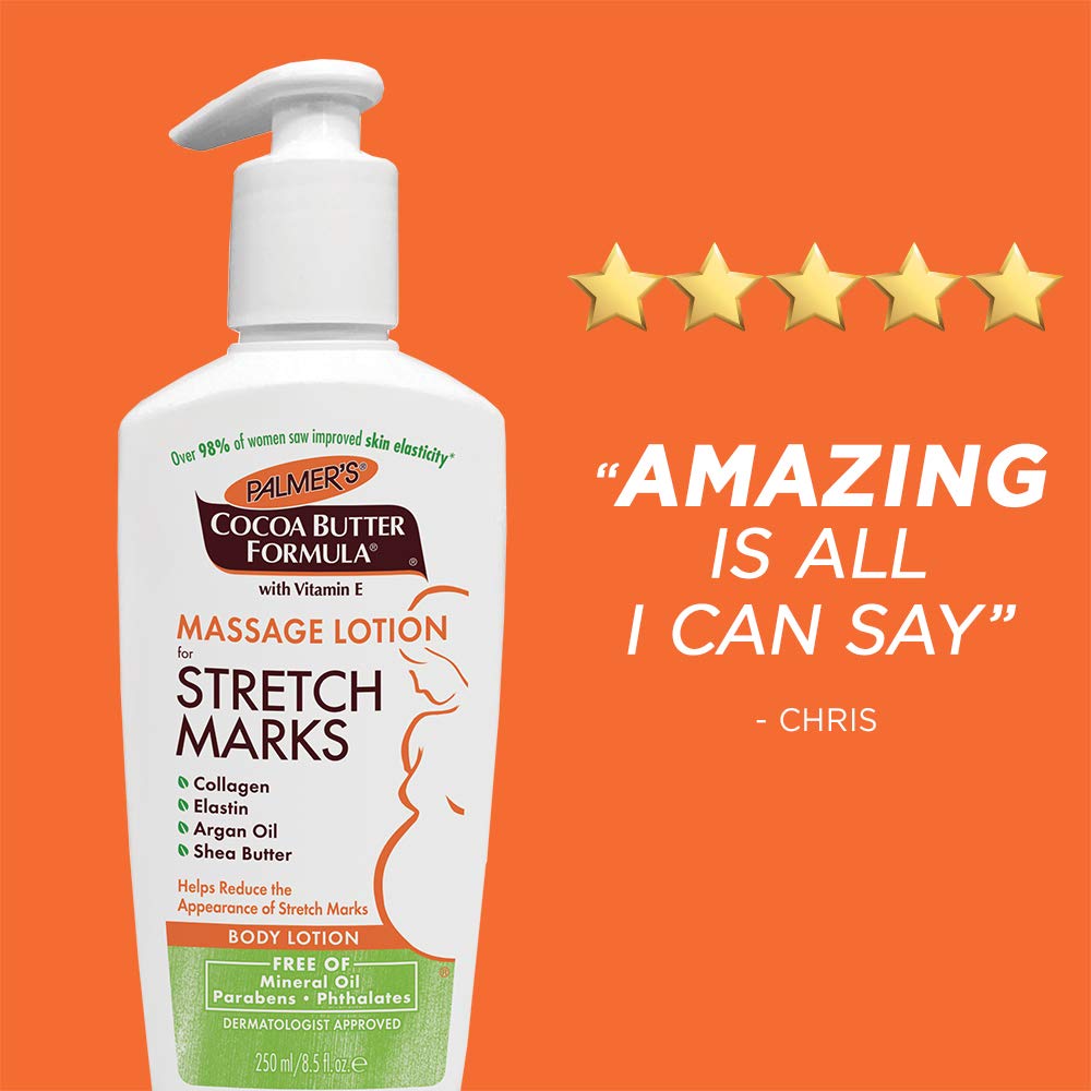 Palmer's Cocoa Butter Formula massage Lotion helps visibly improve skin elasticity and reduce the appearance of stretch marks. Pure cocoa butter and shea butter, natural oils, collagen, elastin, and lutein keep skin moisturized and supple for 48 hours, allowing skin to stretch more easily. Widely recommended for stretch marks during and after pregnancy or weight fluctuation. This non-greasy lotion is ideal for all over body use, in place of your regular moisturizer. Iri infoscan 52 weeks ending 7/19/17 F/D/Mx units based on an 8 week in-home trial by 102 female panelists aged 18 to 49