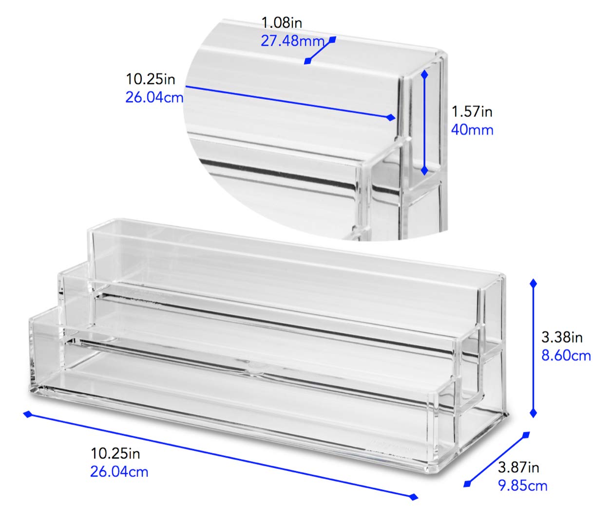 DESIGNED w/ (3) Open Tiers For Lipstick w/ Small to Larger Bases MADE From A Single Piece With The Highest Quality Crystalline Acrylic for a Flawless Clear Look & No Glued Pieces SIZE 10.2L x 3.15W x 3.38H Inches w/10.2L x 1.08W x 1.57H Inch Slots (3) per Tier (Please...