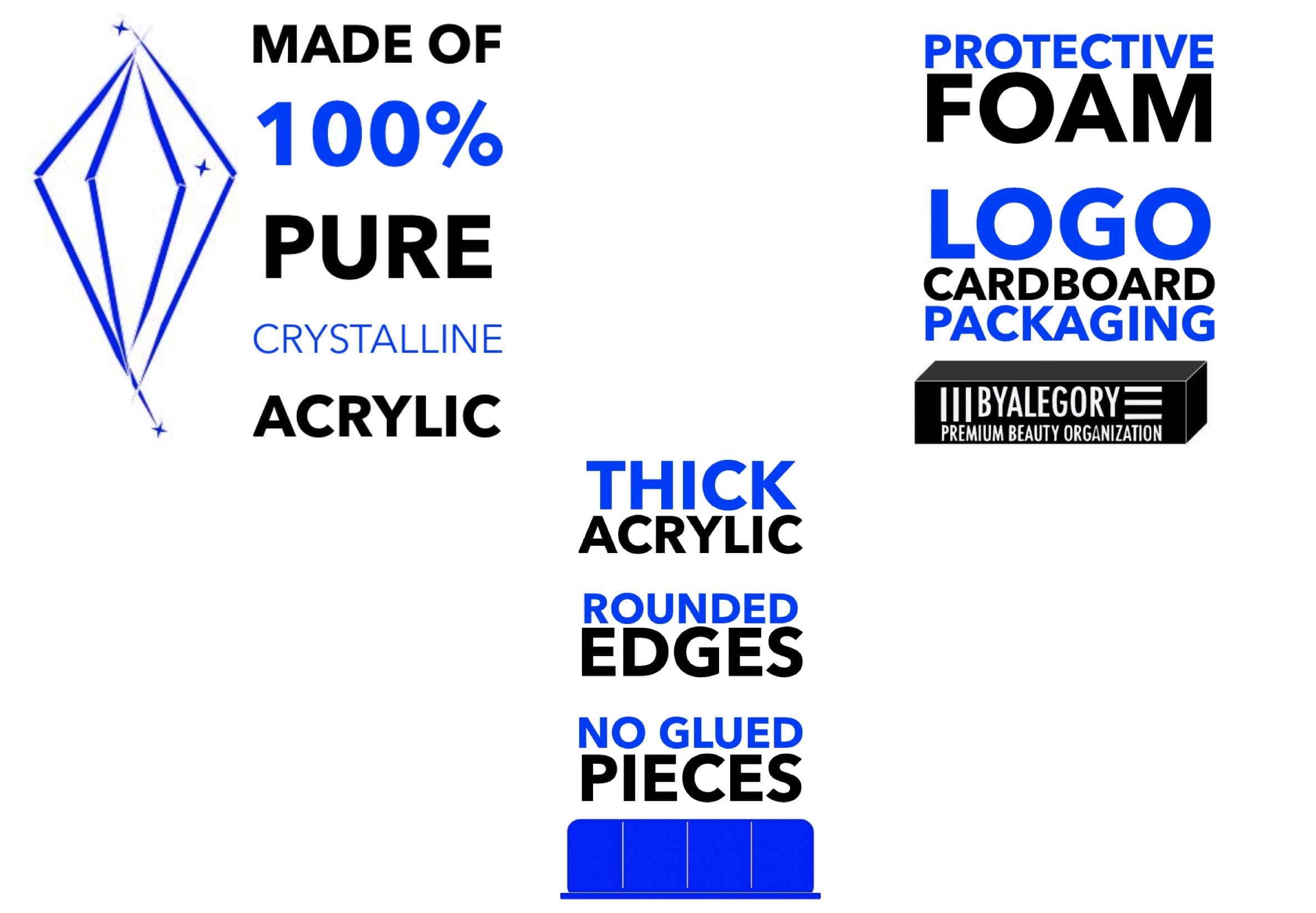 Inspired By Professional Makeup Artists, You Will Notice The Difference In All BY ALEGORY Products When Compared To The Industry Standard. From Design, To Durability, To Functionality, You Will Instantly Notice A Difference In The Feel Of Its Weight, The Look Of Its Color And Realize The Lasting Durability From The Moment You Pick It Up. Imagine Owning A High Quality And Durable Makeup Organizer That You Will Be Instantly Satisfied With And Every Day After. Our Products Are Tailored To Match A Wide Range Of Decor; Whether It Be In Your Personal Bathroom, A Vanity Area Or Your Shop, Our Premium Quality Acrylic Organizers Are Made To Visually Stimulate And Highlight Your Beauty Products. Please Note That Items Displayed Inside The Storage Display Container(s) Are For Demonstration Purposes Only And Are NOT Included.