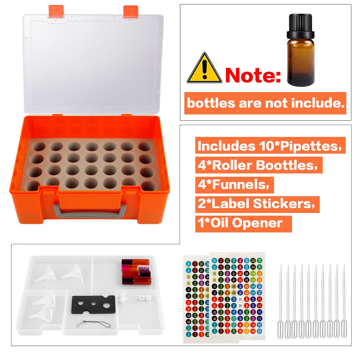 - Essential Oil Case Suitable for: Essential oil organizer case can hold 35 travel essentials oil bottles of 5ml, 10ml and 15ml. Essential oils carrying case fits Lagunamoon/ PURE AROMA/ Artizen/ PURA D’OR/ Anjou/ ESSLUX/ URPOWER/ young living/ radha beauty/ vetiver/ revive essential Oils. Essential oil holder also store other essential oil accessories, includes 2 stickers, 10 pipettes, 4 roller bottles, 4 funnels, 4 roller balls, 1 opener, but excluding essential aromatherapy oils oil bottles.