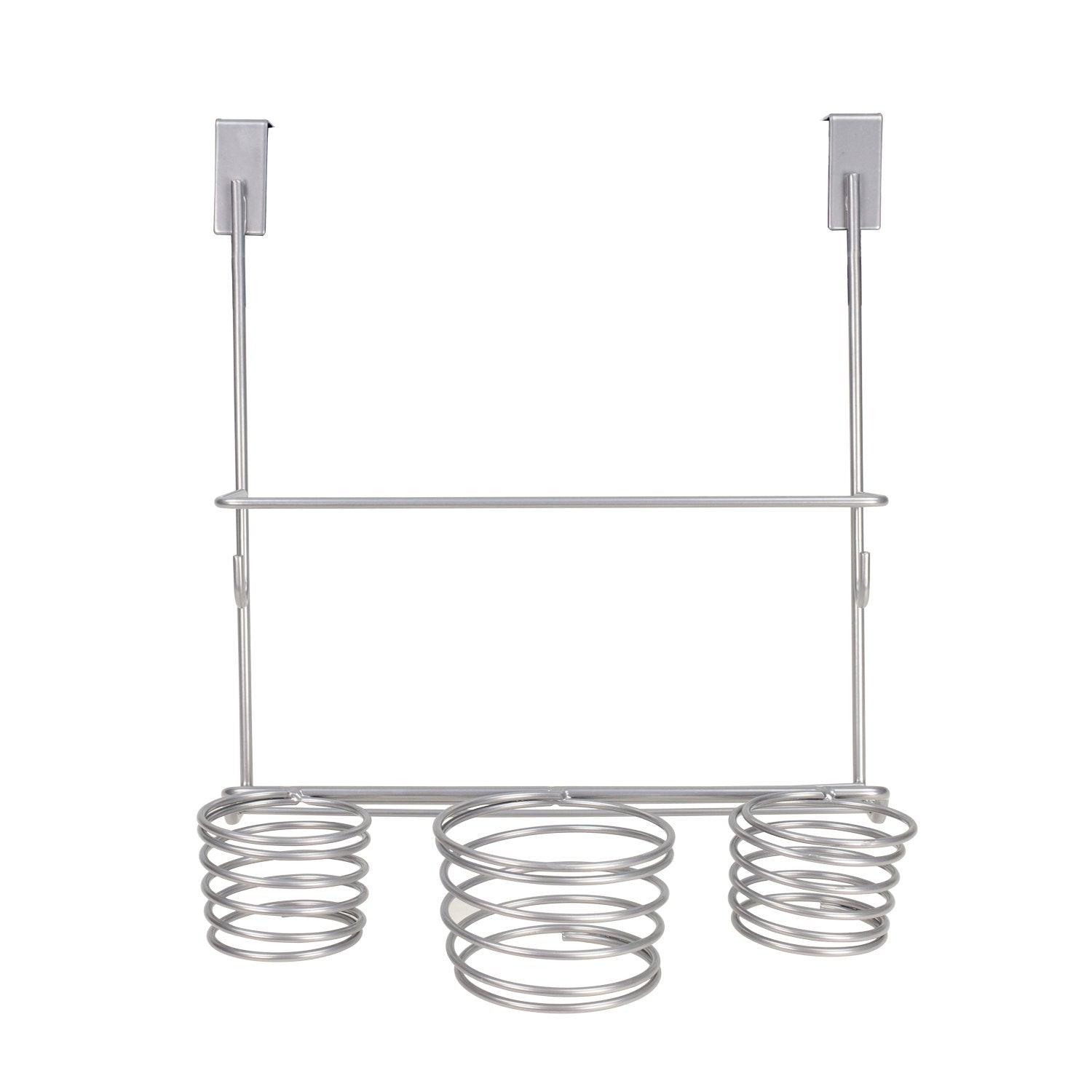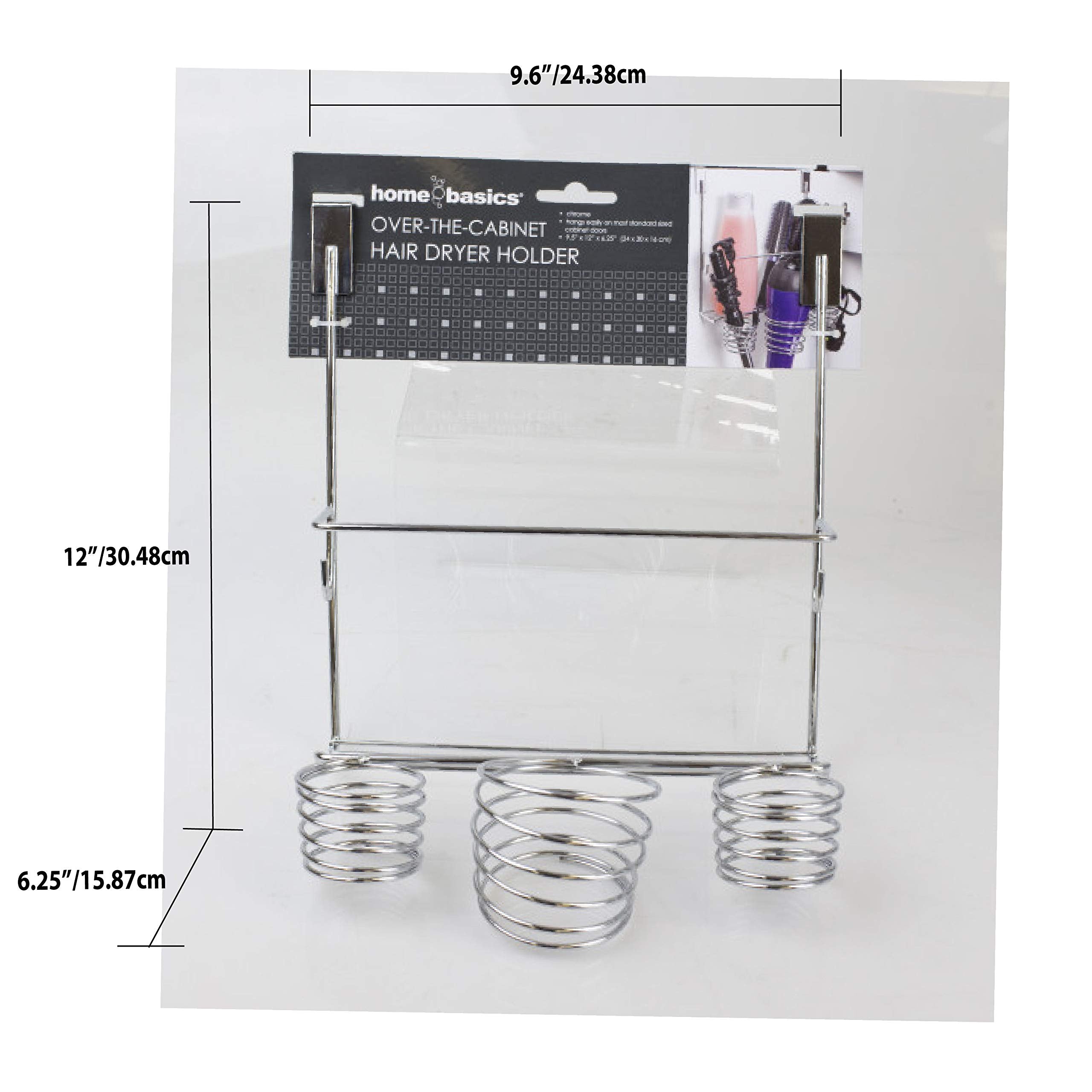 **HOME BASICS OTC HAIRDRYER HOLDER** **Nothing gets in the way of a great hair day when you have this convenient over the cabinet organizer to keep all your tools neatly organized! The organizer easily installs on an interior cabinet door, creating more space below the sink for bigger items like toilet paper. The heat-resistant steel frame allows for hot items such as curling irons, brushes, hair sprays, shampoos, soaps, and straighteners to be discreetly stored away and off the counters. With spring like compartments and a basket to keep cords neatly arranged, you’re able to easily find exactly what you are looking for even during the morning rush Just wipe clean for easy maintenance.** **SOFT PADDED BRACKETS: The soft padded hooks will not scratch or damage the surface of your cabinet** **HEAT-RESISTANT FRAME: The heat-resistant steel frame allows hot styling tools to cool safely** **KEEPS HAIR STYLING CORDS FROM TANGLING: This spacious organizer helps to corral cords so you can easily grab the hair tools you need to get ready**