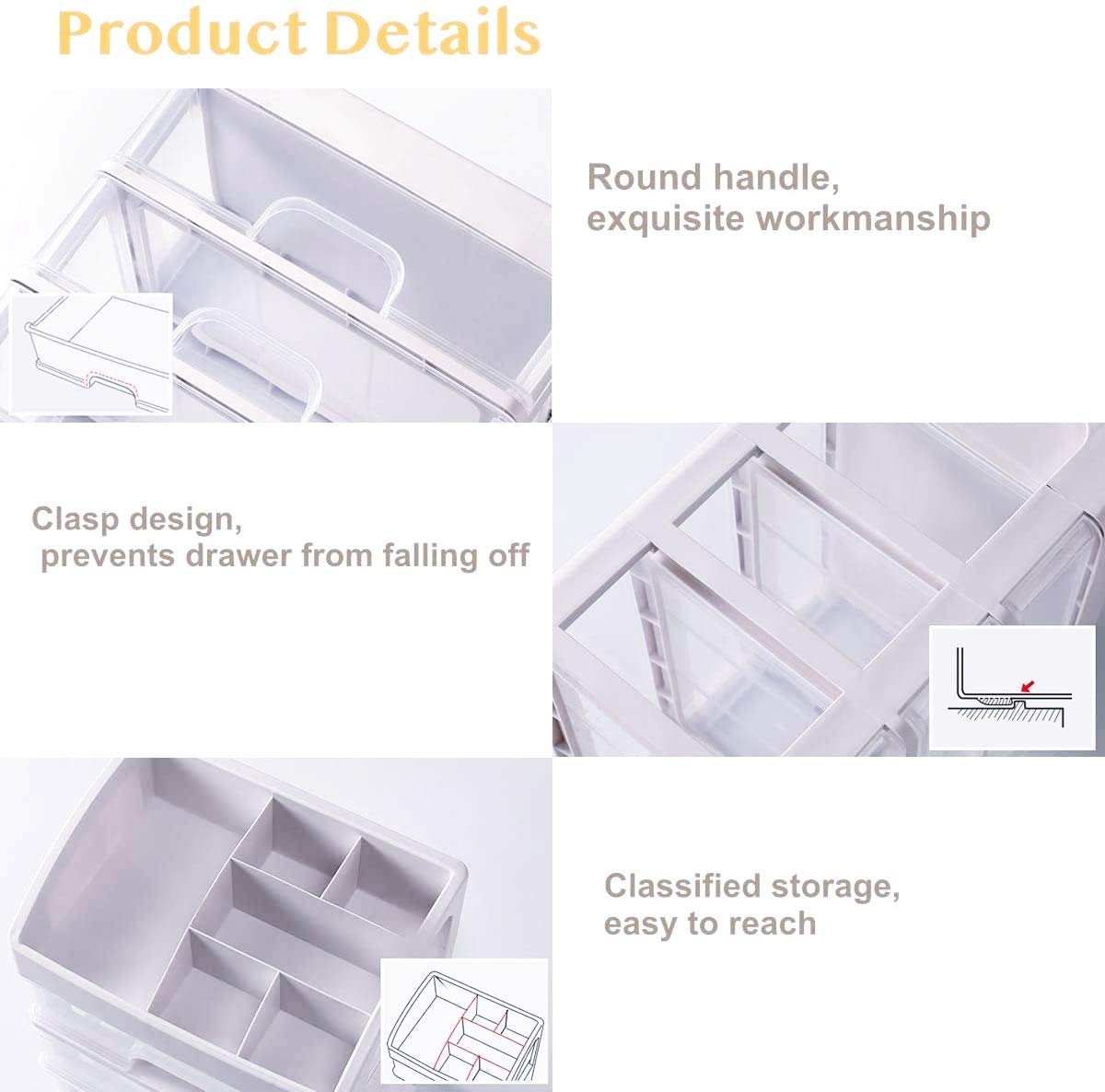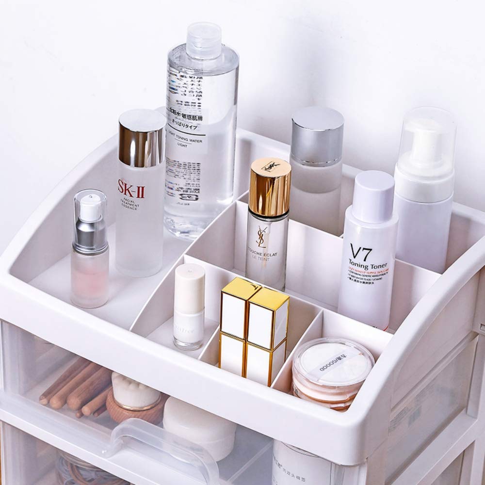 - Large Capacity: There are 6 various-sized top compartments and 3 drawers. The top large compartment is great for storing makeup remover, emulsion, liquid foundation, makeup brushes and perfume. Besides, 3 drawers can hold more accessories like lipsticks, eyeliners, eyebrow pencils, eye shadows, nail polishes and also be used to store jewelry and personal accessories.