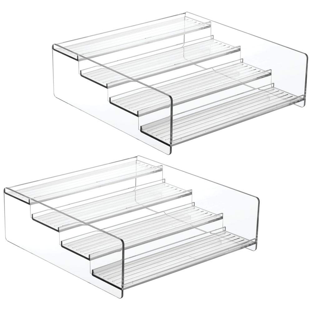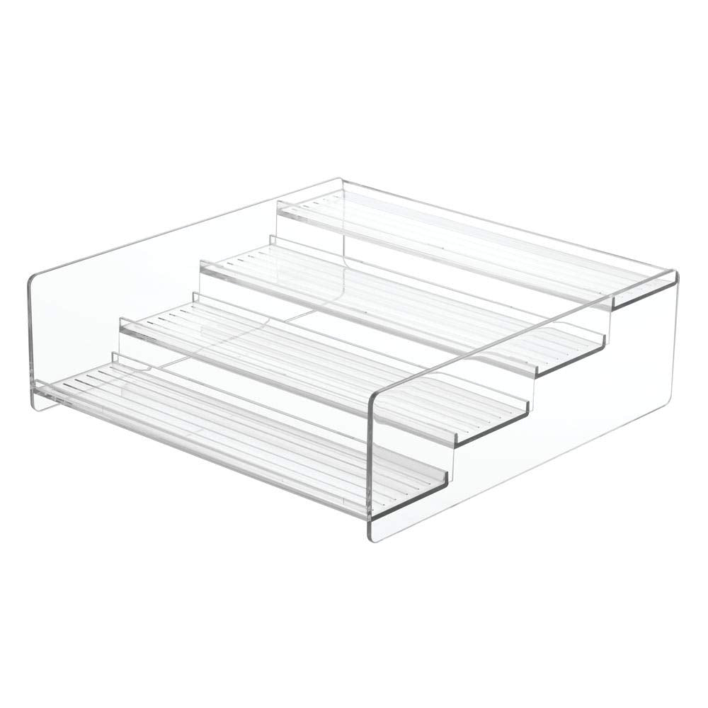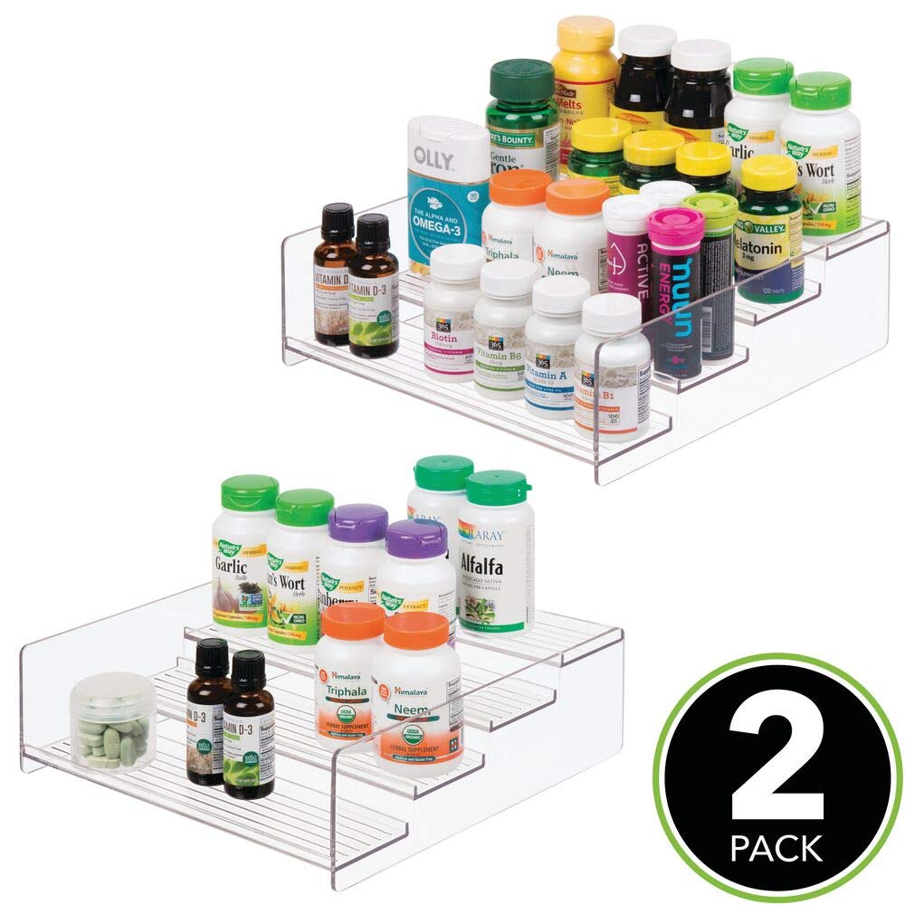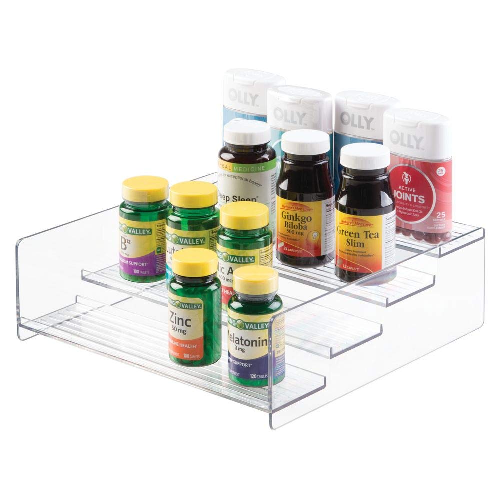 The mDesign Tiered Spice Storage Shelf makes the most of the storage space in your bathroom cabinets. The four level design makes it easy to see what's stored on each shelf and quickly grab what you need. Each shelf keeps aspirin, vitamins, medicines, essential oils, and more in one compact and convenient place. Use with other mDesign organizers bins and racks to create custom storage perfect for your home.