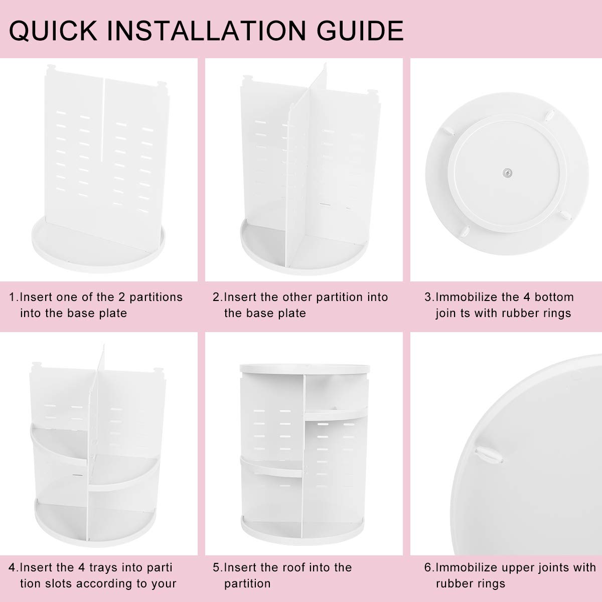 • ★PROFESSIONAL VANITY MAKEUP ORGANIZER: Made of plastic, high quality and convenient for cleaning. 360 Revolving angle makeup shelf help find cosmetics easily. This organizer contains 4-pack trays, If you want the rubber ring, please search ASIN: B071S1W3QP.