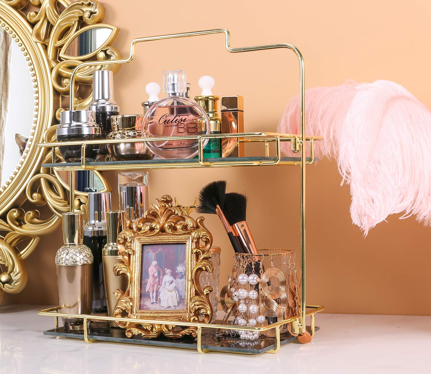 Z PLINRISE Makeup Organizer, 2 Tier Bathroom Cosmetic Storage Shelf for Dresser and Countertop, Decorative Wire Vanity Organizer Basket with Marbling Glass Tray, Gold