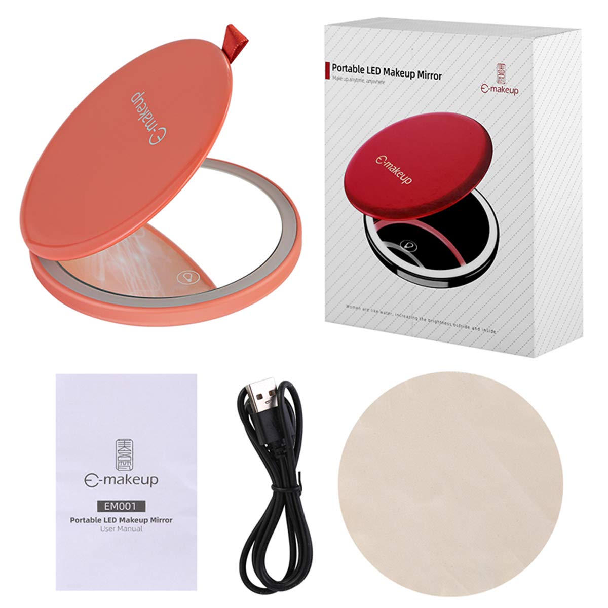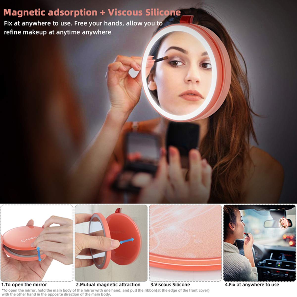 Why Choose E-makeup Makeup Mirror? **Fix at Anywhere Use Anytime** \- This lighted makeup mirror have build-in Magnetic at base and Nano gel paste at cover, so it can attach to metallic and nonmetallic place. This is Unique in the market. **Not only Daytime but also Midnight** \- This compact makeup mirror be with warm led light, it is not only for daytime but also supplement enough light while dim lighting site. like coffee house, wine bar,KTV hotel bathroom, A personal mirror collection for everything from touch-ups makeup, removing contacts, putting on lipstick, eyeliner, eyebrow tweeting, contact lens placement, mascara, eye shadow or any other viewing needs. Essential accessory for makeup like shaving and facial care,let you look beauty and confident.