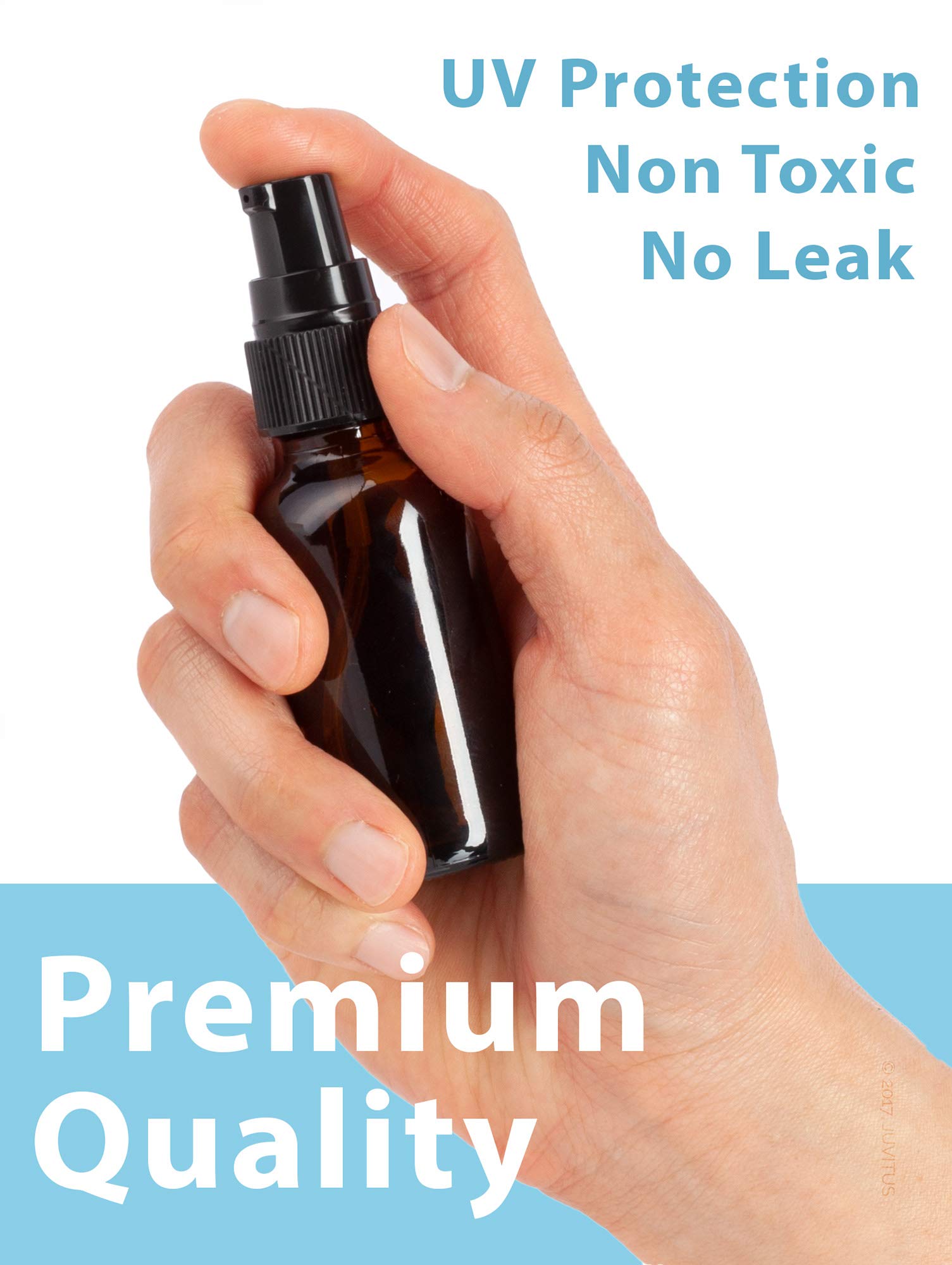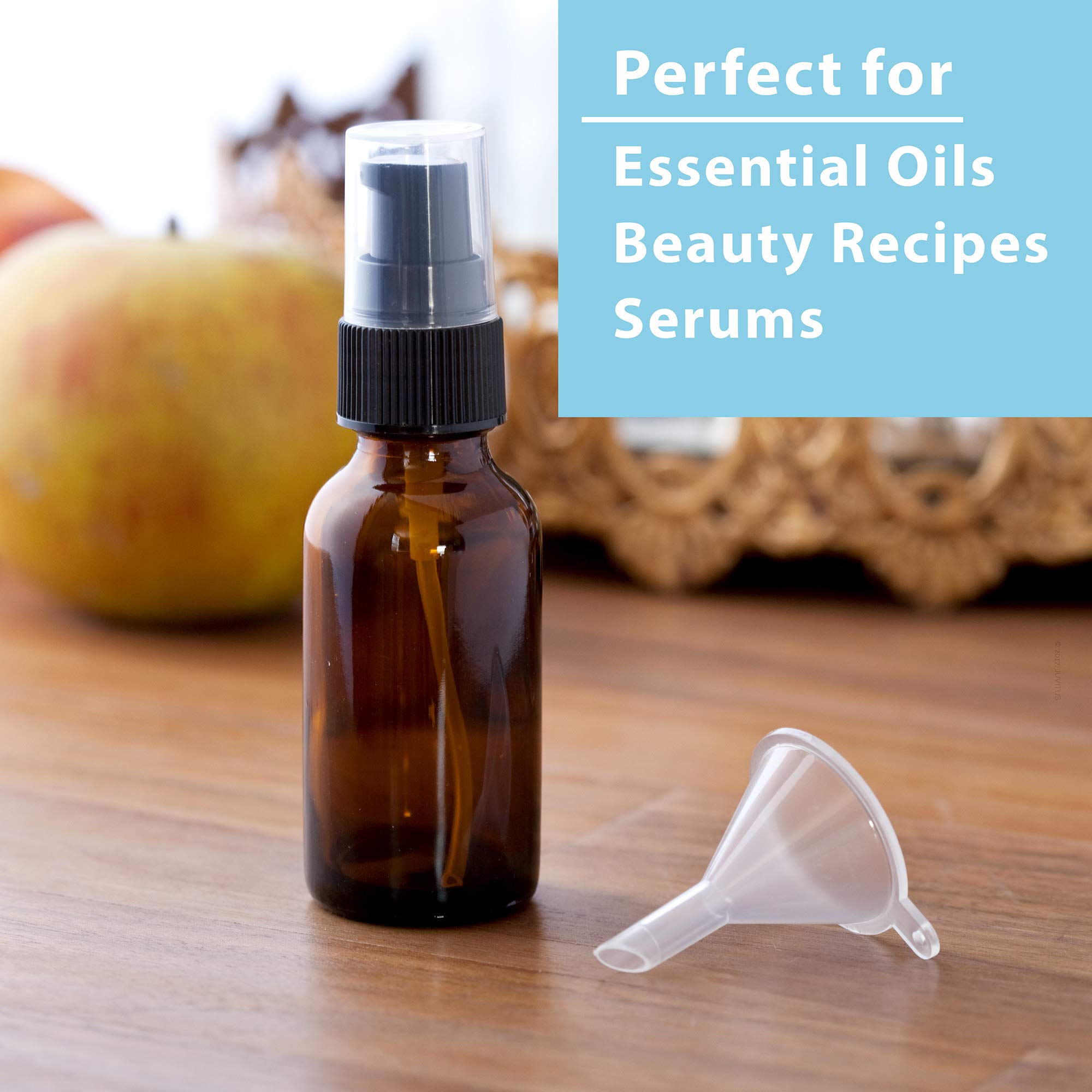 1 oz / 30 ml Amber Glass Boston Round Bottle with Black Treatment Pump (8 Pack) + Clear Travel Bag and Funnel by JUVITUS Store