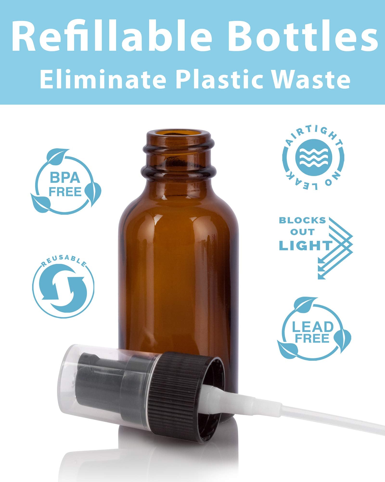 1 oz / 30 ml Amber Glass Boston Round Bottle with Black Treatment Pump (8 Pack) + Clear Travel Bag and Funnel