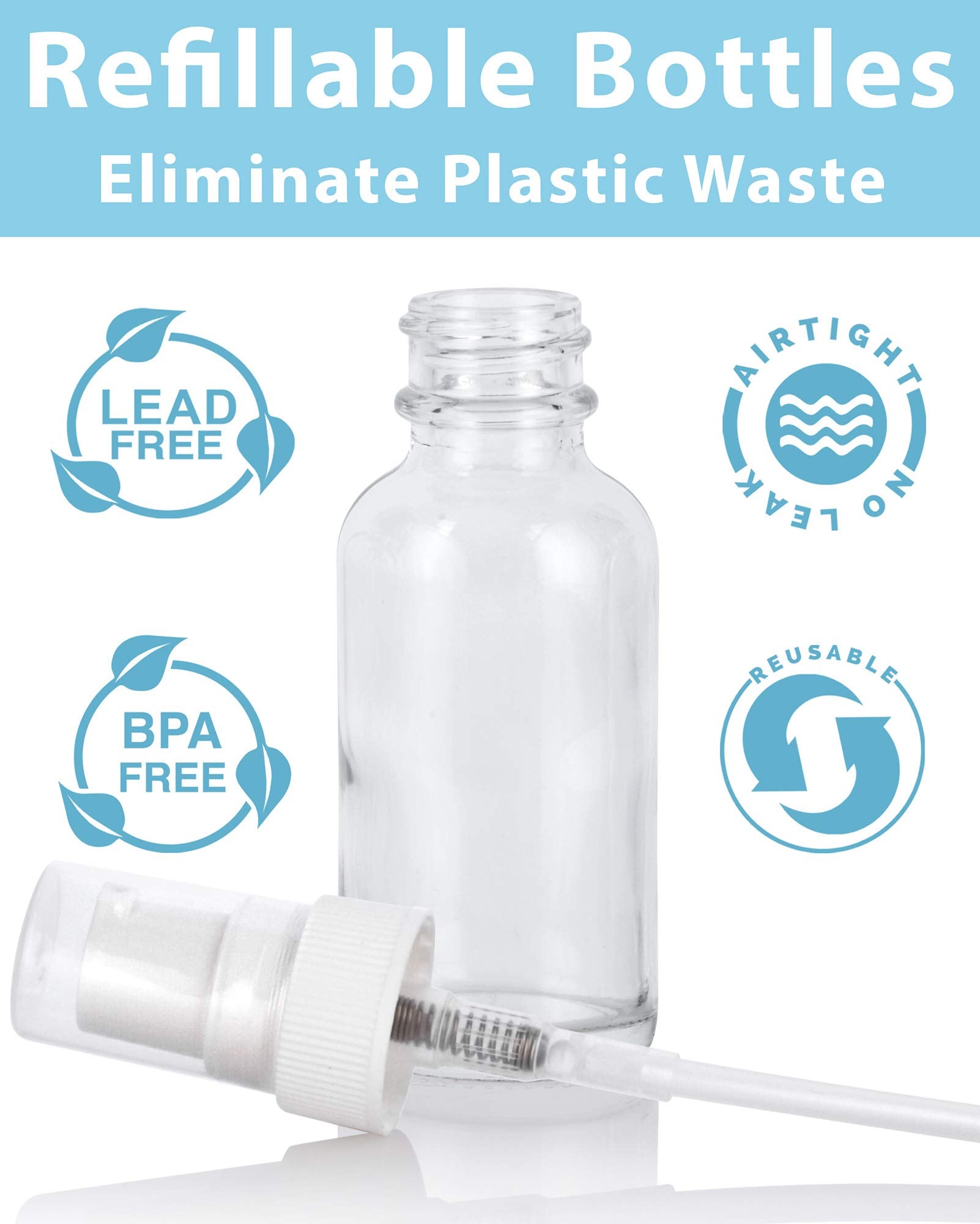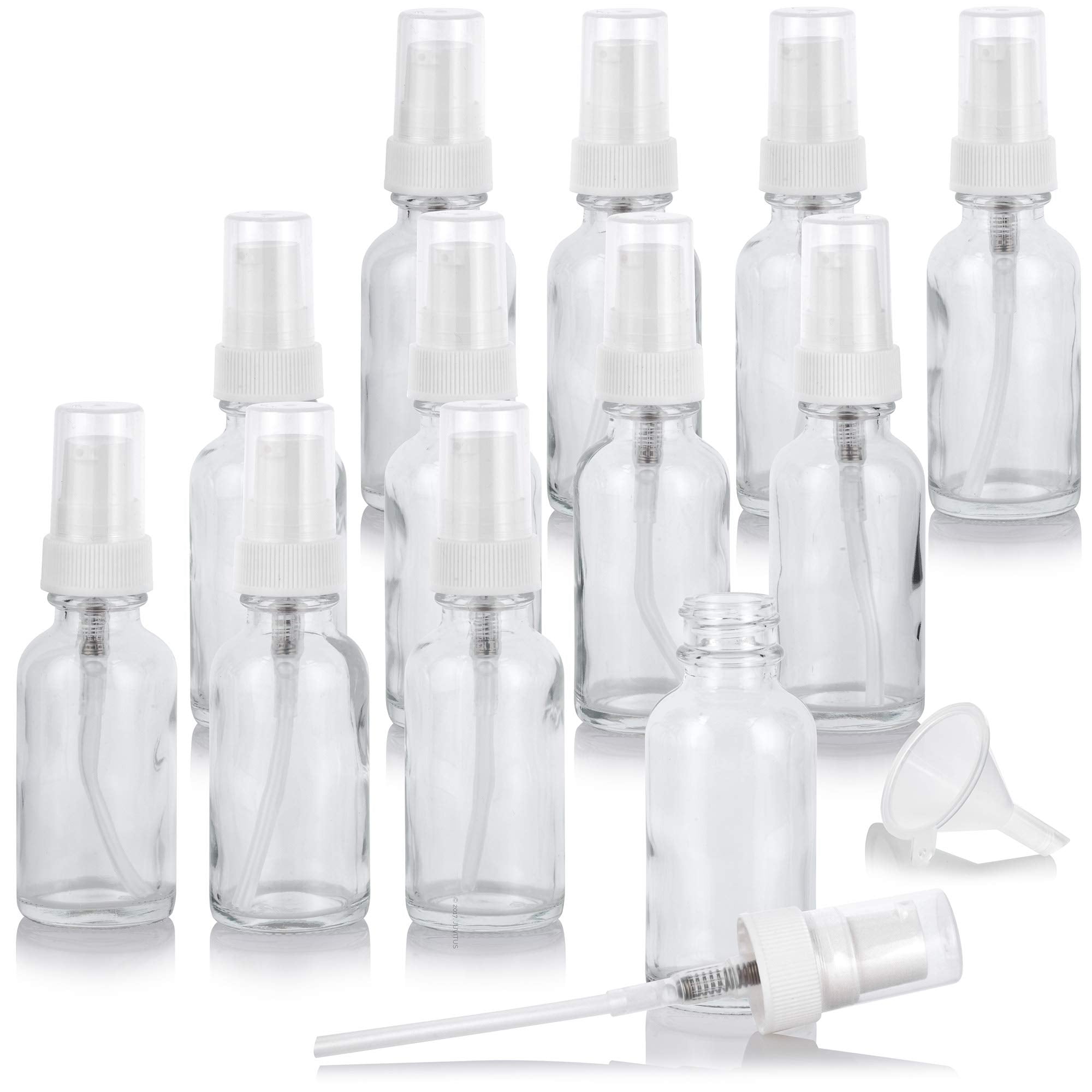 1 oz / 30 ml Clear Glass Boston Round White Treatment Pump Bottle (12 Pack) + Funnel for Cosmetics, serums, Essential Oils, Aromatherapy, Food Grade, bpa Free