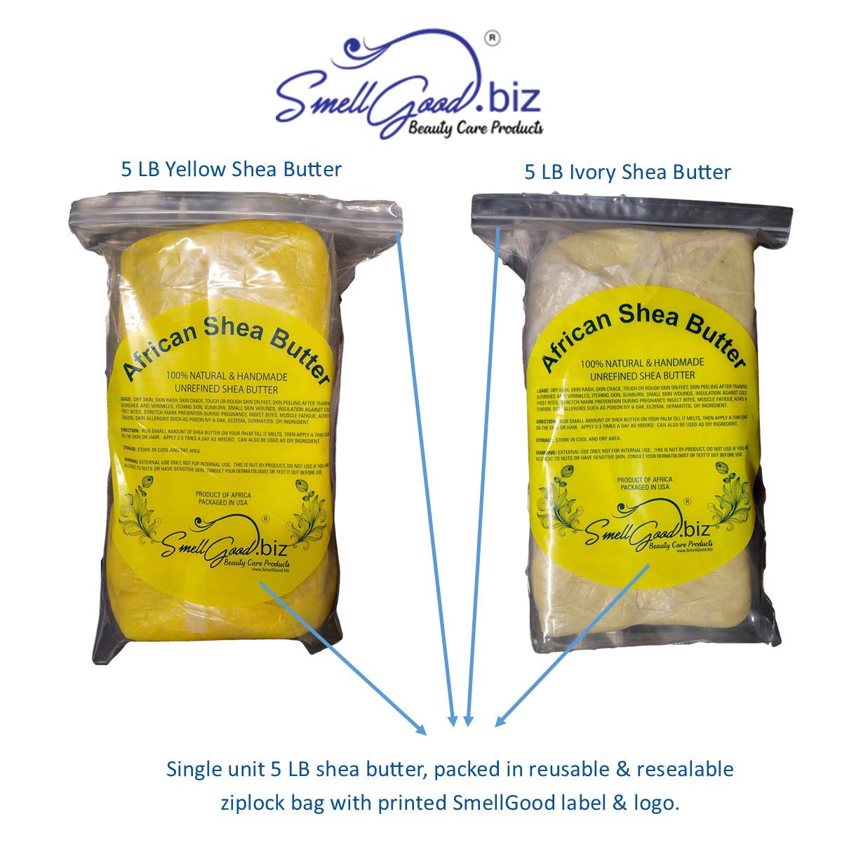 Packaging: SmellGood pure unrefined Shea butter is packaged in USA by melting Shea butter in low temperature without disturbing its bioactive nutrients, then going through micro filter to remove Shea nut shells or debris contained during handmade process in Africa. Filtered butter is quickly re-solidified in below zero temperature. This time consuming process ensures clean and pure Shea butter which you can use easily and directly.