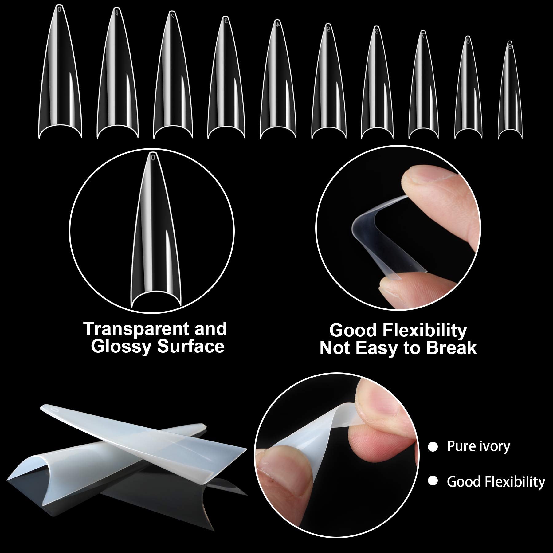• What Will You Get?- You will receive 500pcs clear long stiletto nails and 500pcs natural long stiletto nails.We use transparent boxes to pack according to size.Each box has 10 sizes,and each size has 50 pieces.You can choose your size according to the size of your nails.