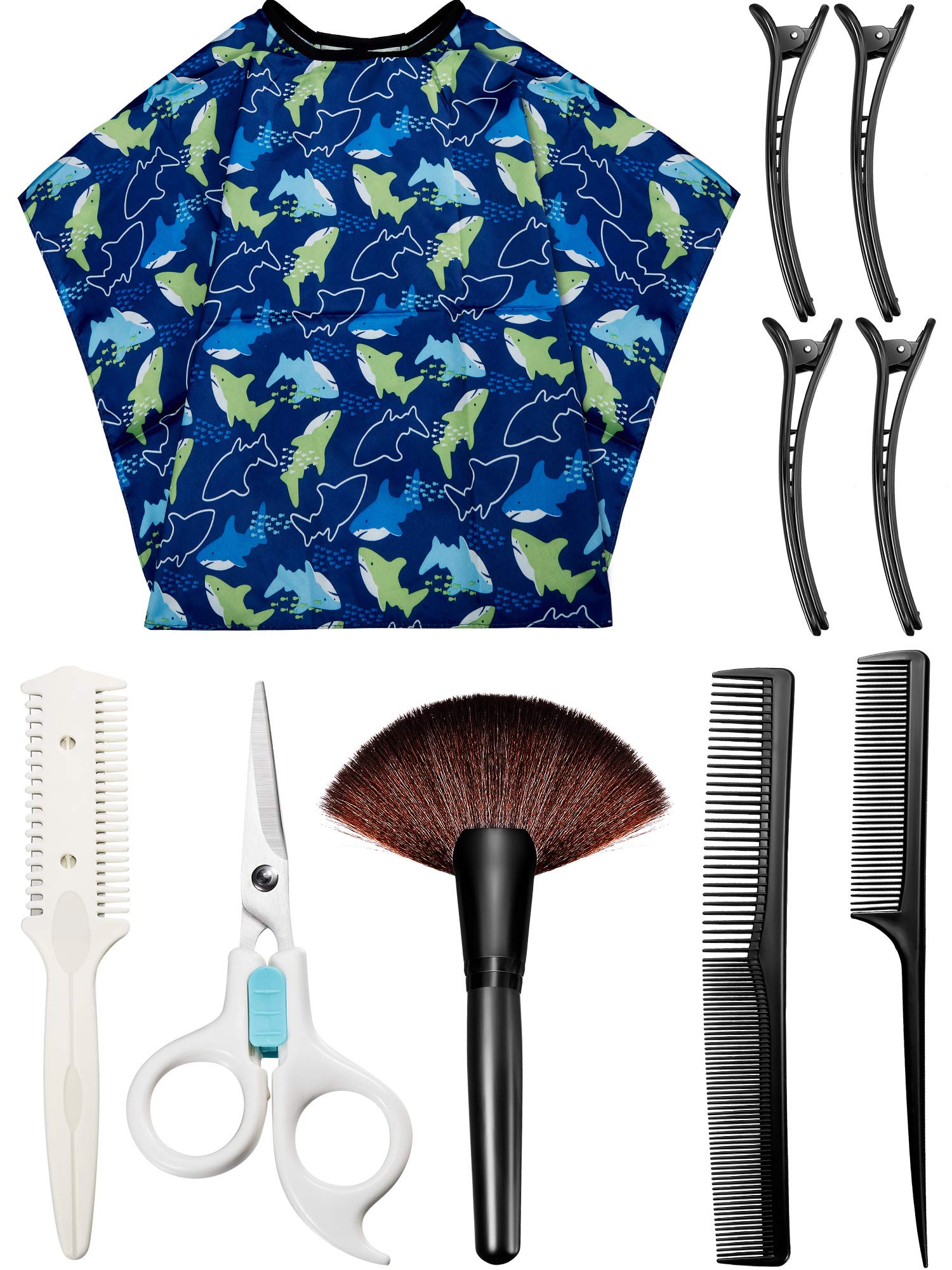 11 Pieces kids haircut set, kids haircut cape children hairdressing apron kid haircut scissor neck duster brush 3 pieces hair cutting combs and 5 pieces hair clips for kids Features: Have haircut at home: The package includes the basic tools of kids haircut, such as scissors, clips, combs, haircut capes, etc., and these haircut accessories also can be applied for daily life, you can use the clips to makeup, do sports and more, use the scissors to trim small items, bring much convenience to you. Make hairdressing easily: The cute blue dolphin pattern easily attract attention of kids, which might make them no longer reject the haircut, this time you can have a easier haircut whether at home or in the barber's, save you much time to care your kids' mood while hair cutting. Specification: Color: as picture shows Size: as picture shows Quantity: 11 pieces totally Package include: 1 x Kids haircut cape 1 x Neck duster brush 1 x Haircut scissors 3 x Haircut combs 5 x Hair clips Note: The color might exist slightly difference due to different displays. Please allow a little error on the size due to manual measurement. Pointed parts may exist, please keep away from little kids.