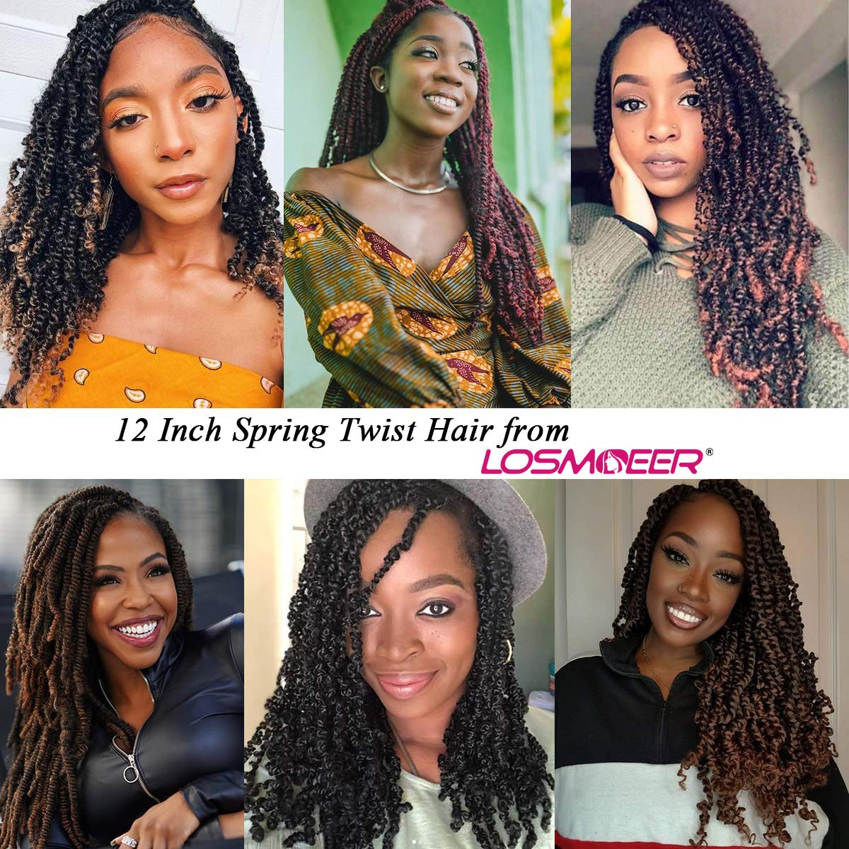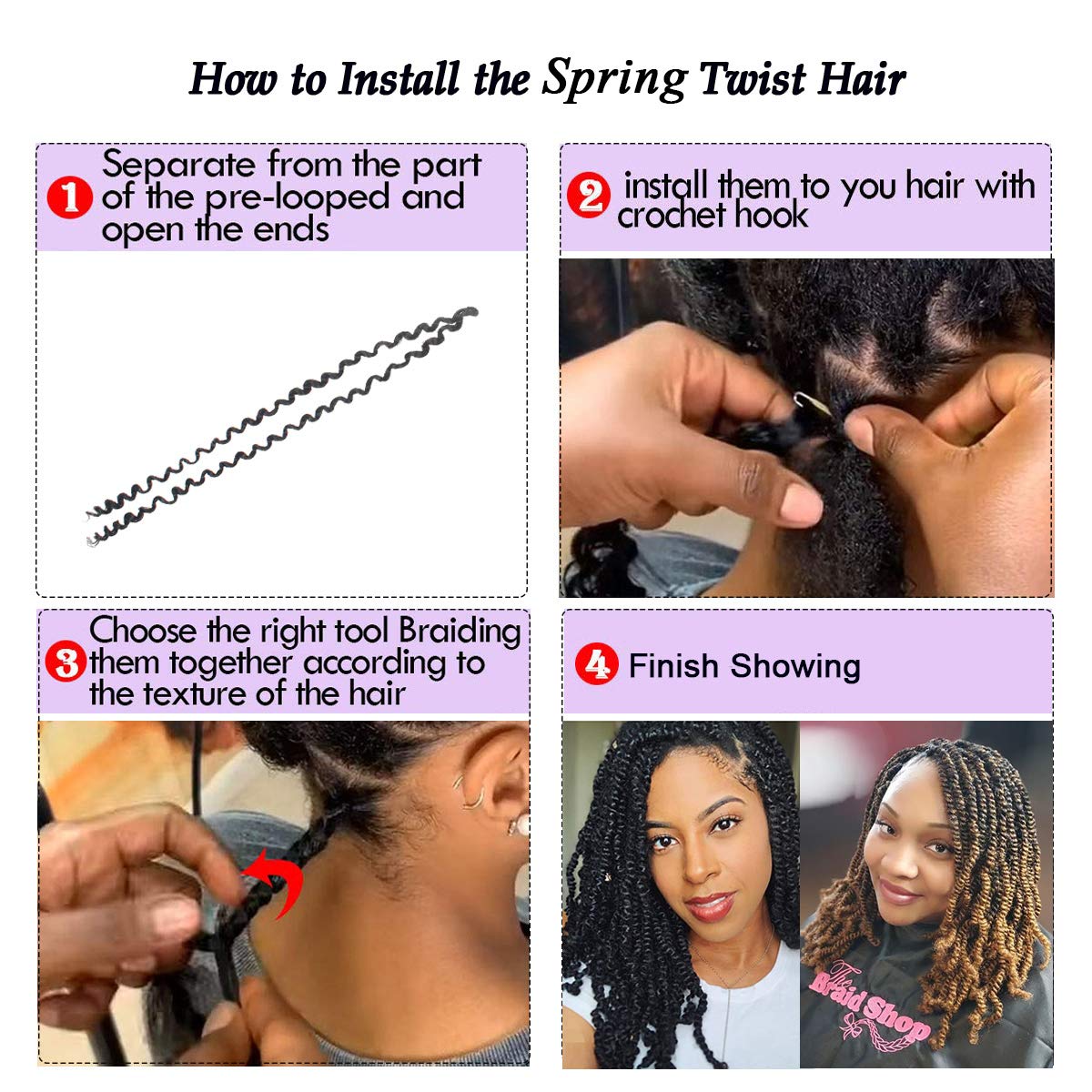 **Hair Material:** 12Inch Long Spring Twist Hair Made by 100% high quality Kanekalon Low Temperature Synthetic Fiber. **Hair Specification:** Length: 12 inch long spring twist hair; Weight-160g/Pack, 4packs/Package, Color: 1B#,T27#, T30#,T33#,T1B/Burgundy,T350#. Usually 3-4packs can full a Head. 12inch long Spring Twist Hair Comes With a free crochet needle and some colorful beads for hairstyle decoration. **Hair Advantages:** Crochet Style is Really Cute, Bouncy Spring Twist, Very Easy to Separate and Install. Much Quicker and Easier to Make A New Look as Your Desire. Super Soft; Lightweight; No Odor; Versatile; Natural & Stylish fluffy twist looking; Long-lasting. **Occasions:** This Spring Twist Hair is Suitable for Daily Use, Work, School,Dating, Party, Traveling, Graduation Ceremony, Whether Adults or Children They all can Use. **Install Notice:** 1.Take out the spring twist from package, open and hold the hair. Then take out one strand hair, completely stretch it and divide it into two halves. 2.Leave some your hair and separate them from the middle. 3.Fold the spring hair, mix them with your hair, then twist them to same direction. 4.Twist your hair and the spring hair together.
