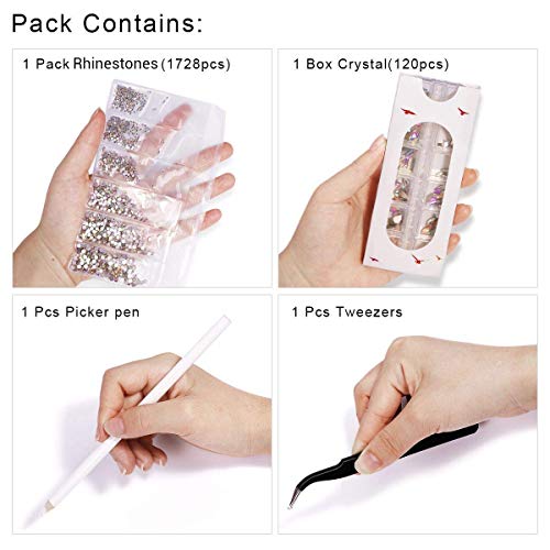 - 【Package Contents】120 pcs high quality glass decorations gems, 12 types shapes, each shape 10 pcs; 1728 pcs mix size nail rhinestones; 1 pcs picking up pen; 1 pcs stainless steel tweezer; 1 pcs storage box. All products are well packaged.