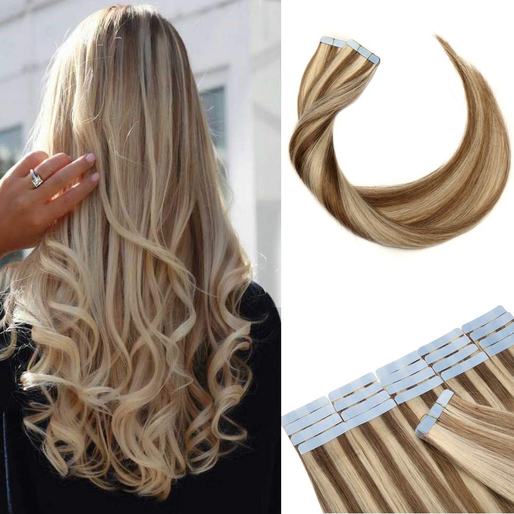 14 Inch 30g Tape in Remy Human Hair Extensions Thin Highlight #12/613 Golden Brown Mix Bleach Blonde Long Straight Glue in Hairpieces Seamless Skin Weft with Invisible Double Sided Tape 20pc/pack by Hairro Store