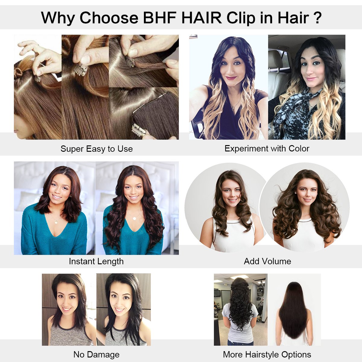 **The 70gram BHF clip-in hair extensions come in a 6-piece set that is incredibly easy to apply and has been specially designed to add length &volume.** Remy Human Hair Clip in Extensions Consist: One-8"(20cm) wide wefts-4 clips per weft Two-6"(15cm) wide wefts-3 clips per weft One-4"(10cm)wide wefts-2 clip per weft Two-2"(5cm) wide wefts-1 clip per weft Unbelievably versatile ¨C the set naturally blend with your own hair and can be styled with hot tools. **Why Choose BHF Hair Clip in Hair Extensions** **1.Super Easy to Use:** Clipping in Hair extensions is so quick and easy, anyone can do it! See the above photo to find how it works. **2.Instant Length:** Do you feel like your hair just not grow? Or maybe you got a bad haircut and miss your long locks? Remy human hair clip in extensions is the quickest and simplest way to get beautiful long hair. **3.Add Volume:** Transform your hair from thin,to thick and voluminous locks that you have always dreamed of in just minutes. **4.Experiment with Color:** Want to change up your hair color, but do not want to dye your hair? Use BHF Clip in Hair extensions to experiment with highlights or lowlights,or even try out an Ombre look. **5.No Damage:** Clip in Hair extensions are safe to wear and cause absolutely no damage to your hair - clip them in and out whenever you like. **6.More Hairstyle Options:** Got that special event coming up - Wedding? Prom? First date? Add a little ¡oomph¡¯ to your hair with BHF Hair extensions, and turn heads with your impressive curls, braids, ponytails, and any other hairstyle you create! **7.We are Always Here to Help:** We¡¯re happy if you¡¯re happy! You can exchange or refund your set if you are not fully satisfied with it. We are always here to help and answer all emails within 24 hours,7 days a week.