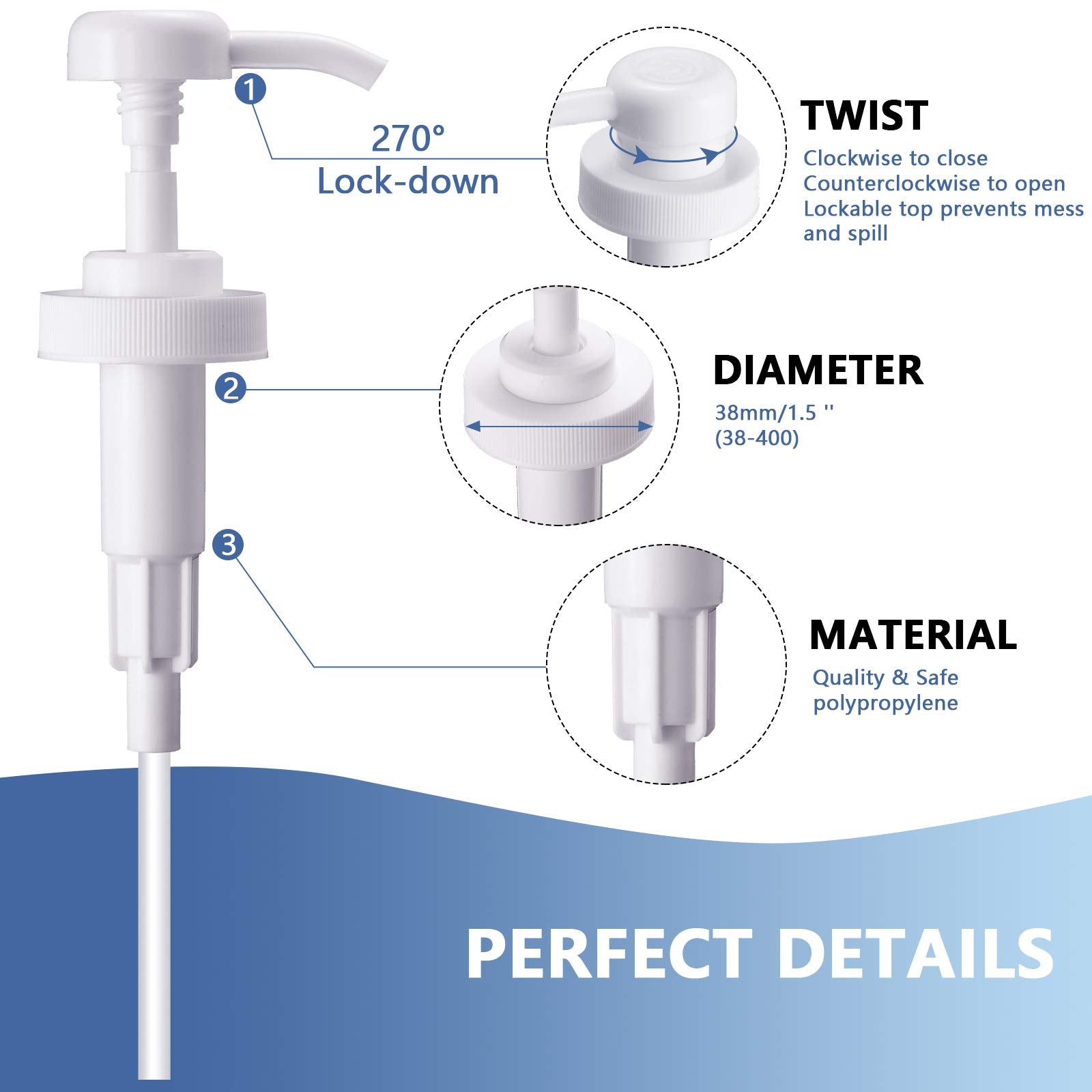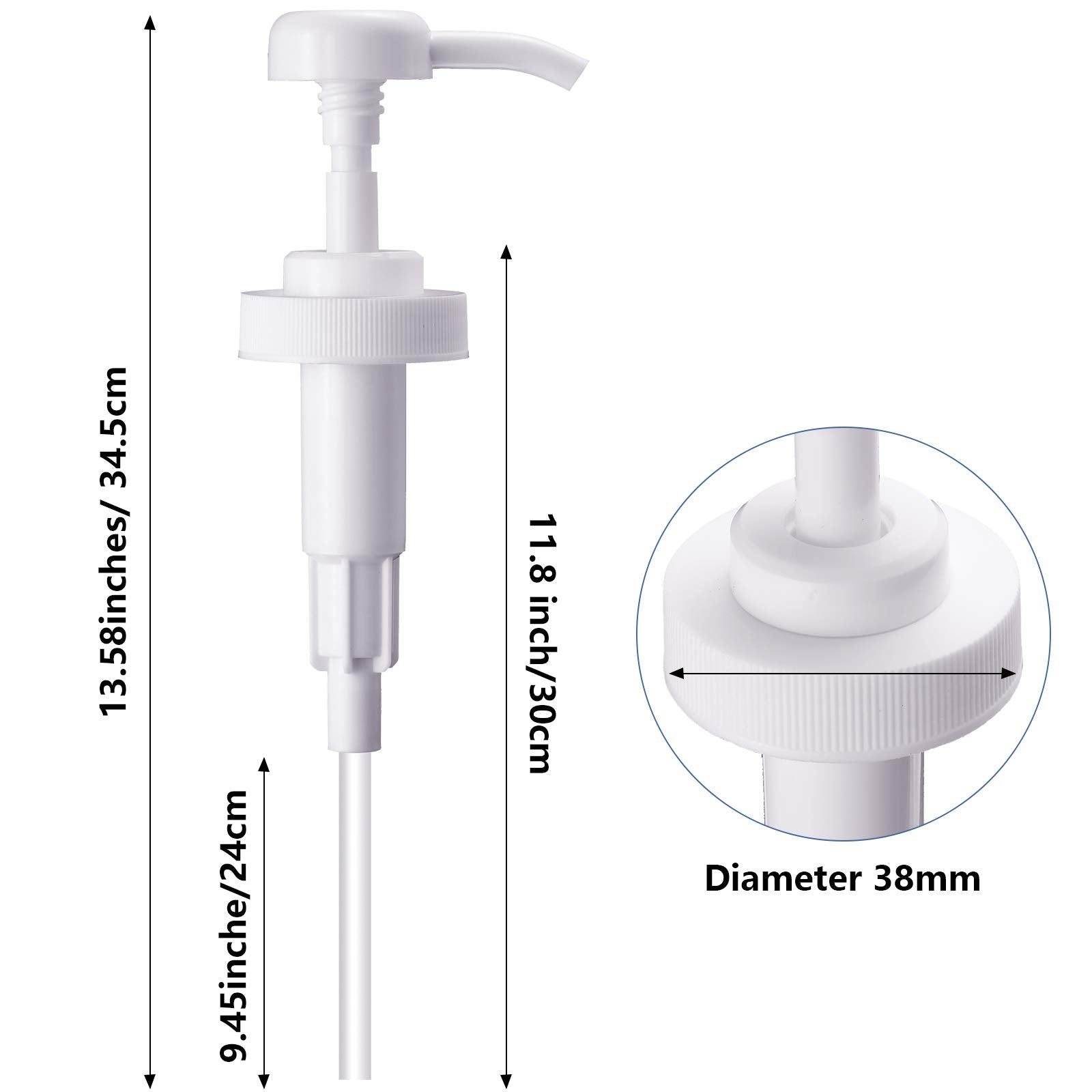 - Size information: the diameter of the cap part of this thread gallon pump dispenser is 38 mm, please confirm the caliber of the bottle before purchasing, 11.8 inches long dip tube can be trimmed to fit shorter containers, 4cc pumping capacity per stroke regulates the amount of product to limit product waste