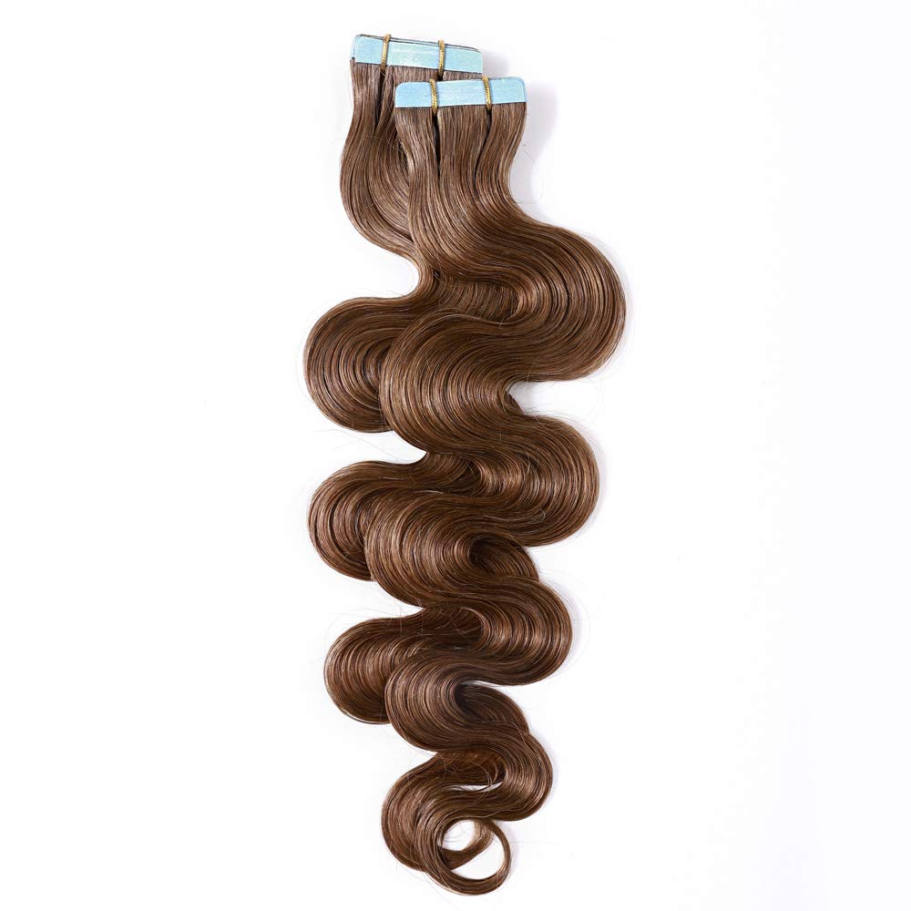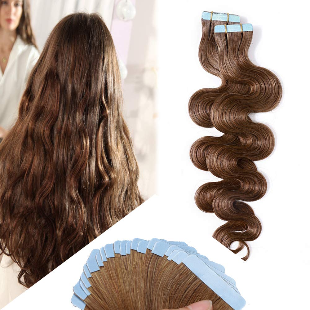 18 Inch Tape in Hair Extensions Body Wavy Human Hair 100g Thin Long Hair 40pcs/pack Seamless Skin Weft Glue in Wavy Hairpieces with Invisible Double Sided Tapes #6 Light Brown