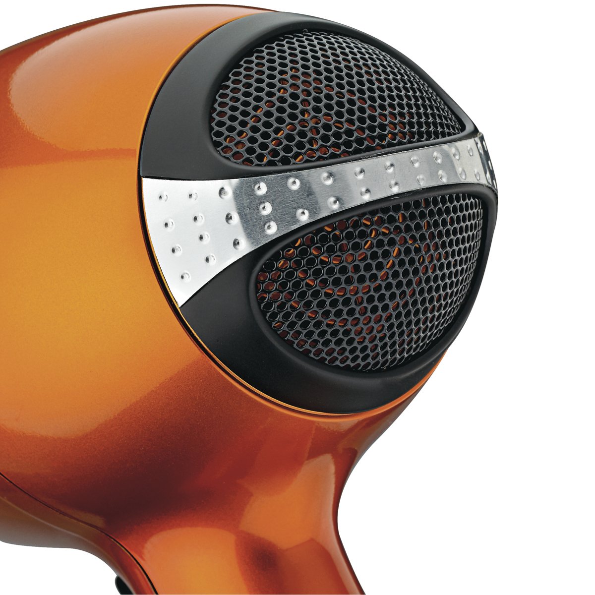 Colour Family: ORANGE Finish: CERAMIC . Lightweight ceramic ionic dryer with AC motor 1875 watts for fast drying power AC motor delivers more powerful, fast air flow and lasts 3 times longer than a regular motor 35% lighter weight than traditional AC motor Ionic technology to reduce frizz and to enhance shine Ceramic technology safely dries and promotes healthy hair 3 heat and 2 speed settings rocker switches True cold shot Removable filter Concentrator Diffuser Hang ring for easy storage