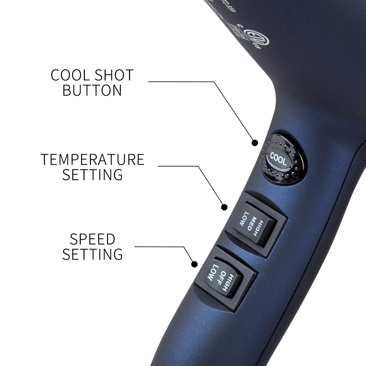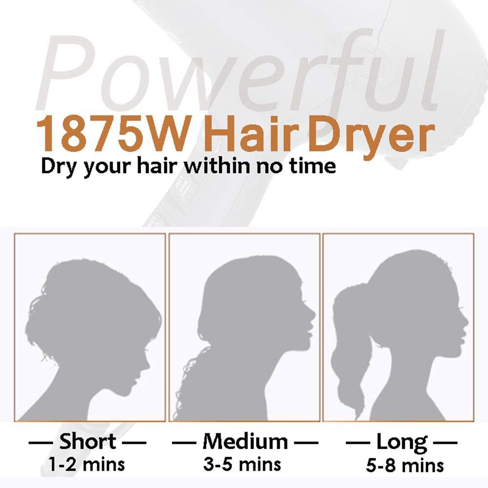 **Light Weight DC Motor** High-quality DC Motor, lasts longer, less noisy and provide an extra powerful air flow. A blow dryer with 1875 watts of power decreases drying time, protecting against heat damage. **Ionic Technology** Generates negative ions, helps to smooth hair and lock in moisture, enables the hair to endure much higher levels of heat without creating damage. **3 Heat Settings/ 2 Speeds Settings** Adjustable temperature and speeds, helps to avoid heat damage. Use lower settings for styling and higher temperature settings for powerful drying. Getting the most use out of your dryer. **Cool Shot Button** Lock in your style with the cool shot button that provides a blast of cold air to hold your look all day long. **Removable Air Filter** Double safety net, prevent hair drawn into the duct, easy to clean. **ETL Approved &ALCI Safety Plug** ALCI protective plug, leakage protection function automatically activated to prevent short circuit, ensures the safety of you and your family. **Attachments Tool:** 1.Concentrator: The narrow air concentrator is ideal for precision styling on straight, smooth hair. that aids in straightening sections of hair for a sleek shine. 2.Diffuser: Give your curls the attention they deserve with hair diffuser, designed to enhance your natural curl and texture, especially with wavy or curly hair. **Product Features** Color:Black Power:1875 Watt Voltage: 125VAC, 60Hz Power Supply: 100-125V DC Motor Working Mode: 2 Speed /3 heat Cable length: 8.7ft / 2.65m Weight: 1.46lb/663g. **Package Contents** 1 * 1875W Ions hair dryer 1 * Concentrated nozzle 1 * Diffuser 1 * User manual